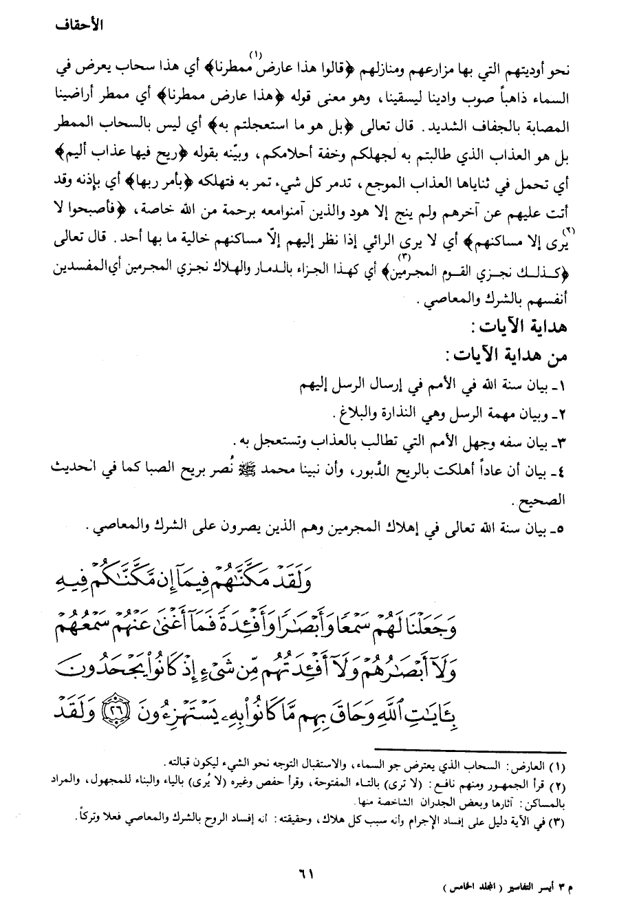 وَلَقَدْ مَكَّنَّاهُمْ فِيمَا إِنْ مَكَّنَّاكُمْ فِيهِ وَجَعَلْنَا لَهُمْ سَمْعاً وَأَبْصَاراً وَأَفْئِدَةً فَمَا أَغْنَى عَنْهُمْ سَمْعُهُمْ وَلا أَبْصَارُهُمْ وَلا أَفْئِدَتُهُمْ مِنْ شَيْءٍ إِذْ كَانُوا يَجْحَدُونَ بِآياتِ اللهِ وَحَاقَ بِهِمْ مَا كَانُوا بِهِ يَسْتَهْزِئُونَ (26) وَلَقَدْ