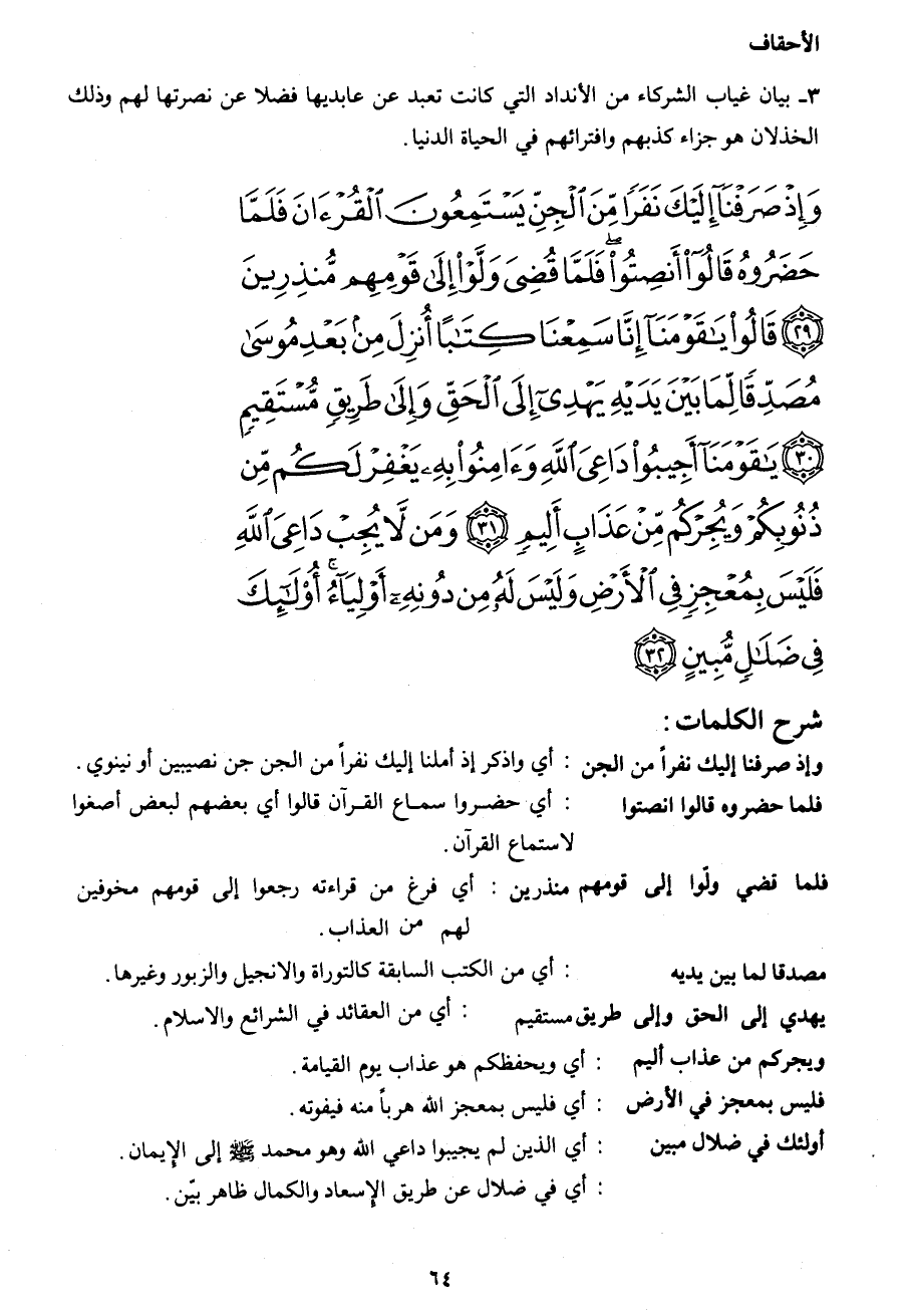 قَالُوا يَا قَوْمَنَا إِنَّا سَمِعْنَا كِتَاباً أُنْزِلَ مِنْ بَعْدِ مُوسَى مُصَدِّقاً لِمَا بَيْنَ يَدَيْهِ يَهْدِي إِلَى الْحَقِّ وَإِلَى طَرِيقٍ مُسْتَقِيمٍ (30) يَا قَوْمَنَا أَجِيبُوا دَاعِيَ اللهِ وَآمِنُوا بِهِ يَغْفِرْ لَكُمْ مِنْ ذُنُوبِكُمْ وَيُجِرْكُمْ مِنْ عَذَابٍ أَلِيمٍ (31) وَمَنْ لا يُجِبْ دَاعِيَ اللهِ فَلَيْسَ بِمُعْجِزٍ فِي الْأَرْضِ وَلَيْسَ لَهُ مِنْ دُونِهِ أَوْلِيَاءُ أُولَئِكَ فِي ضَلالٍ مُبِينٍ (32)