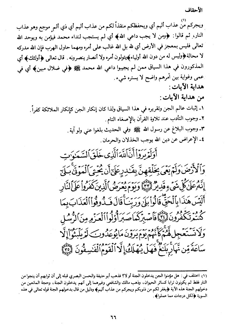 أَوَلَمْ يَرَوْا أَنَّ اللهَ الَّذِي خَلَقَ السَّمَاوَاتِ وَالْأَرْضَ وَلَمْ يَعْيَ بِخَلْقِهِنَّ بِقَادِرٍ عَلَى أَنْ يُحْيِيَ الْمَوْتَى بَلَى إِنَّهُ عَلَى كُلِّ شَيْءٍ قَدِيرٌ (33) وَيَوْمَ يُعْرَضُ الَّذِينَ كَفَرُوا عَلَى النَّارِ أَلَيْسَ هَذَا بِالْحَقِّ قَالُوا بَلَى وَرَبِّنَا قَالَ فَذُوقُوا الْعَذَابَ بِمَا كُنْتُمْ تَكْفُرُونَ (34) فَاصْبِرْ كَمَا صَبَرَ أُولُوا الْعَزْمِ مِنَ الرُّسُلِ وَلا تَسْتَعْجِلْ لَهُمْ كَأَنَّهُمْ يَوْمَ يَرَوْنَ مَا يُوعَدُونَ لَمْ يَلْبَثُوا إِلَّا سَاعَةً مِنْ نَهَارٍ بَلاغٌ فَهَلْ يُهْلَكُ إِلَّا الْقَوْمُ الْفَاسِقُونَ (35)