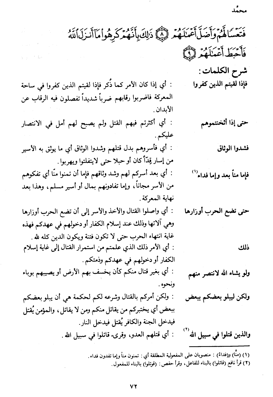 فإما مناً بعد وإما فداء1: أي بعد أسركم لهم وشد وثاقهم فإما أن تمنوا مناً أي تفكوهم من الأسر مجاناً,