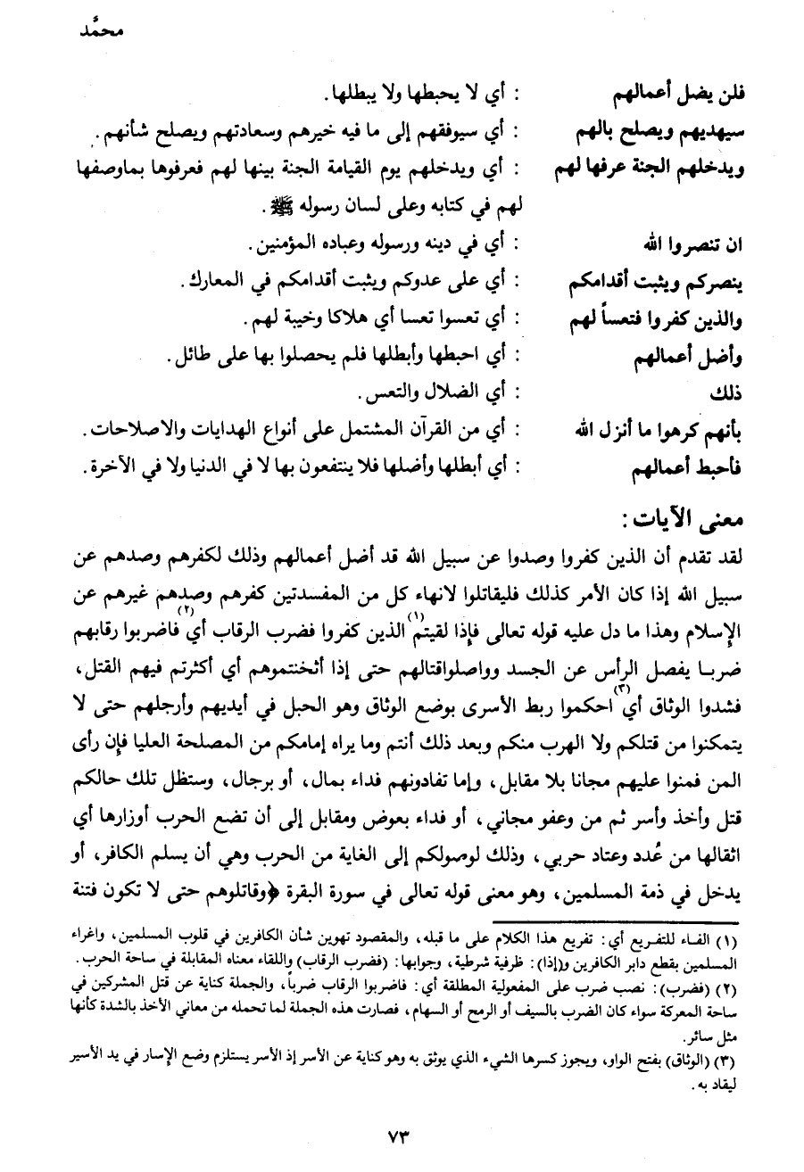 لقد تقدم أن الذين كفروا وصدوا عن سبيل الله قد أضل أعمالهم وذلك لكفرهم وصدهم عن سبيل الله إذا كان الأمر كذلك فليقاتلوا لإنهاء كل من المفسدتين كفرهم وصدهم غيرهم عن الإسلام وهذا ما دل عليه قوله تعالى فإذا لقيتم1 الذين كفروا فضرب الرقاب أي2 فاضربوا رقابهم ضربا يفصل الرأس عن الجسد وواصلوا قتالهم حتى إذا أثخنتموهم أي أكثرتم فيهم القتل, فشدوا الوثاق أي3 احكموا ربط الأسرى بوضع الوثاق وهو الحبل في أيديهم وأرجلهم حتى لا يتمكنوا من قتلكم ولا الهرب منكم وبعد ذلك أنتم وما يراه إمامكم من المصلحة العليا فإن رأى المن فمنوا عليهم مجانا بلا مقابل, وإما تفادونهم فداء بمال, أو برجال, وستظل تلك حالكم قتل وأخذ وأسر ثم من عفو مجاني, أو فداء بعوض ومقابل إلى أن تضع الحرب أوزارها أي أثقالها من عدد وعتاد حربي, وذلك لوصولكم إلى الغاية من الحرب وهي أن يسلم الكافر, أو يدخل في ذمة المسلمين, وهو معنى قوله تعالى في سورة البقرة {وَقَاتِلُوهُمْ حَتَّى لا تَكُونَ فِتْنَةٌ
