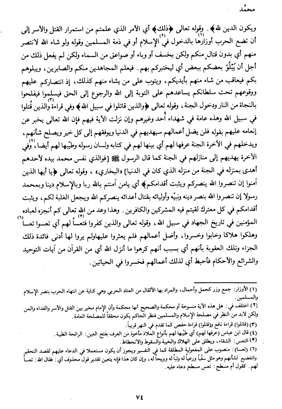 وَيَكُونَ الدِّينُ لِلَّهِ} . وقوله تعالى {ذَلِكَ} أي الأمر الذي علمتم من استمرار القتل والأسر إلى أن تضع الحرب أوزارها1 بالدخول في2 الإسلام أو في ذمة المسلمين وقوله ولو شاء الله لانتصر منهم أي بدون قتال منكم ولكن بخسف أو وباء أو صواعق من السماء ولكن لم يفعل ذلك من أجل أن يبلوا بعضكم ببعض أي ليختبركم بهم. فيعلم المجاهدين منكم والصابرين, ويبلوهم بكم فيعاقب من شاء منهم بأيديكم, ويتوب على من يشاء منهم كذلك, إذ انتصارهم عليكم ووقوعهم تحت سلطانكم يساعدهم على التوبة إلى الله والرجوع إلى الحق فيسلموا فيفلحوا بالنجاة من النار ودخول الجنة, وقوله تعالى {وَالَّذِينَ قُاتلُوا فِي سَبِيلِ اللهِ} وفي قراءة3 والذين قتلوا في سبيل الله وهذه عامة في شهداء أحد وغيرهم وإن نزلت الآية فيهم فإن الله تعالى يخبر عن أنعامه عليهم بقوله فلن يضل أعمالهم سيهديهم في الدنيا ويوفقهم إلى كل خير ويصلح شأنهم, ويدخلهم في الآخرة الجنة عرفها لهم أي بينها لهم في كتابه ولسان رسوله وطيبها لهم أيضاً,4 وفي الآخرة يهديهم إلى منازلهم في الجنة كما قال الرسول صَلَّى اللهُ عَلَيْهِ وَسَلَّمَ " فوالذي نفس محمد بيده لأحدهم أهدى بمنزله في الجنة من منزله الذي كان بالدنيا" (البخاري) , وقوله تعالى {يَا أَيُّهَا الَّذِينَ آمَنُوا إِنْ تَنْصُرُوا اللهَ يَنْصُرْكُمْ وَيُثَبِّتْ أَقْدَامَكُمْ} أي يا من آمنتم بالله ربا وبالإسلام دينا وبمحمد رسولا أن تنصروا الله بنصر دينه ونبيه وأوليائه بقتال أعدائه ينصركم الله ويجعل الغلبة لكم, ويثبت أقدامكم في كل معترك لقيتم فيه المشركين والكافرين. وهذا وعد من الله تعالى كم أنجزه لعباده المؤمنين في تاريخ الجهاد في سبيل الله، وقوله تعالى والذين كفروا فتعساً5 لهم أي تعسوا تعسا6 وهلكوا هلاكا وخابوا وخسروا، وأضل أعمالهم فلم يعثروا عليها ولم يروا لها أدنى فائدة ذلك الجزاء وتلك العقوبة بأنهم أي بسبب أنهم كرهوا ما أنزل الله أي من القرآن من آيات التوحيد والشرائع والأحكام فأحبط أي لذلك أعمالهم فخسروا في الحياتين.