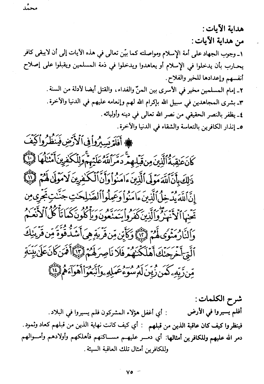 أَفَلَمْ يَسِيرُوا فِي الْأَرْضِ فَيَنْظُرُوا كَيْفَ كَانَ عَاقِبَةُ الَّذِينَ مِنْ قَبْلِهِمْ دَمَّرَ اللهُ عَلَيْهِمْ وَلِلْكَافِرِينَ أَمْثَالُهَا (10) ذَلِكَ بِأَنَّ اللهَ مَوْلَى الَّذِينَ آمَنُوا وَأَنَّ الْكَافِرِينَ لا مَوْلَى لَهُمْ (11) إِنَّ اللهَ يُدْخِلُ الَّذِينَ آمَنُوا وَعَمِلُوا الصَّالِحَاتِ جَنَّاتٍ تَجْرِي مِنْ تَحْتِهَا الْأَنْهَارُ وَالَّذِينَ كَفَرُوا يَتَمَتَّعُونَ وَيَأْكُلُونَ كَمَا تَأْكُلُ الْأَنْعَامُ وَالنَّارُ مَثْوىً لَهُمْ (12) وَكَأَيِّنْ مِنْ قَرْيَةٍ هِيَ أَشَدُّ قُوَّةً مِنْ قَرْيَتِكَ الَّتِي أَخْرَجَتْكَ أَهْلَكْنَاهُمْ فَلا نَاصِرَ لَهُمْ (13) أَفَمَنْ كَانَ عَلَى بَيِّنَةٍ مِنْ رَبِّهِ كَمَنْ زُيِّنَ لَهُ سُوءُ عَمَلِهِ وَاتَّبَعُوا أَهْوَاءَهُمْ (14)