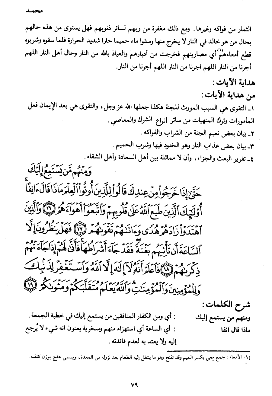 وَمِنْهُمْ مَنْ يَسْتَمِعُ إِلَيْكَ حَتَّى إِذَا خَرَجُوا مِنْ عِنْدِكَ قَالُوا لِلَّذِينَ أُوتُوا الْعِلْمَ مَاذَا قَالَ آنِفاً أُولَئِكَ الَّذِينَ طَبَعَ اللهُ عَلَى قُلُوبِهِمْ وَاتَّبَعُوا أَهْوَاءَهُمْ (16) وَالَّذِينَ اهْتَدَوْا زَادَهُمْ هُدىً وَآتَاهُمْ تَقْوَاهُمْ (17) فَهَلْ يَنْظُرُونَ إِلَّا السَّاعَةَ أَنْ تَأْتِيَهُمْ بَغْتَةً فَقَدْ جَاءَ أَشْرَاطُهَا فَأَنَّى لَهُمْ إِذَا جَاءَتْهُمْ ذِكْرَاهُمْ (18) فَاعْلَمْ أَنَّهُ لا إِلَهَ إِلَّا اللهُ وَاسْتَغْفِرْ لِذَنْبِكَ وَلِلْمُؤْمِنِينَ وَالْمُؤْمِنَاتِ وَاللهُ يَعْلَمُ مُتَقَلَّبَكُمْ وَمَثْوَاكُمْ (19)