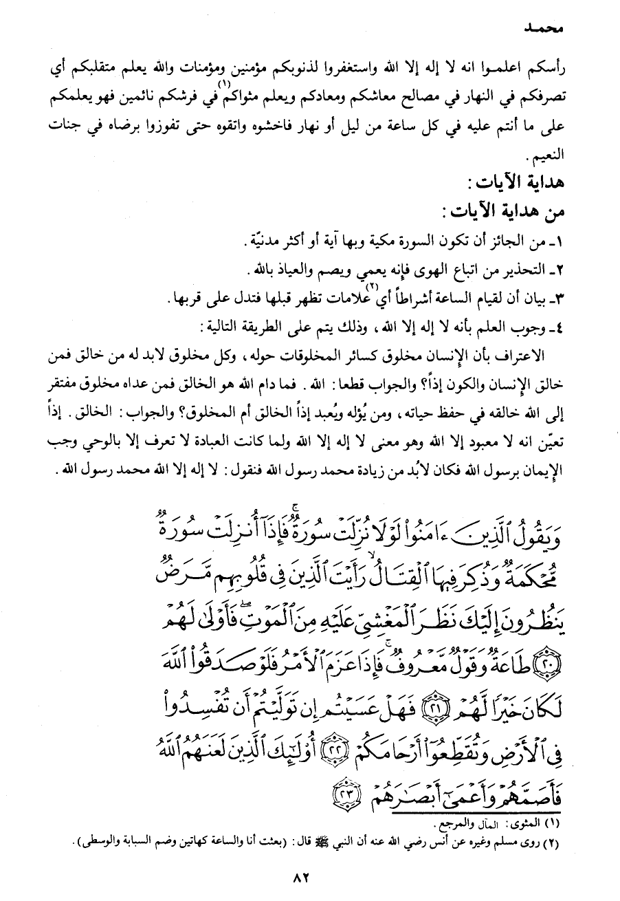 وَيَقُولُ الَّذِينَ آمَنُوا لَوْلا نُزِّلَتْ سُورَةٌ فَإِذَا أُنْزِلَتْ سُورَةٌ مُحْكَمَةٌ وَذُكِرَ فِيهَا الْقِتَالُ رَأَيْتَ الَّذِينَ فِي قُلُوبِهِمْ مَرَضٌ يَنْظُرُونَ إِلَيْكَ نَظَرَ الْمَغْشِيِّ عَلَيْهِ مِنَ الْمَوْتِ فَأَوْلَى لَهُمْ (20) طَاعَةٌ وَقَوْلٌ مَعْرُوفٌ فَإِذَا عَزَمَ الْأَمْرُ فَلَوْ صَدَقُوا اللهَ لَكَانَ خَيْراً لَهُمْ (21) فَهَلْ عَسَيْتُمْ إِنْ تَوَلَّيْتُمْ أَنْ تُفْسِدُوا فِي الْأَرْضِ وَتُقَطِّعُوا أَرْحَامَكُمْ (22) أُولَئِكَ الَّذِينَ لَعَنَهُمُ اللهُ فَأَصَمَّهُمْ وَأَعْمَى أَبْصَارَهُمْ (23)