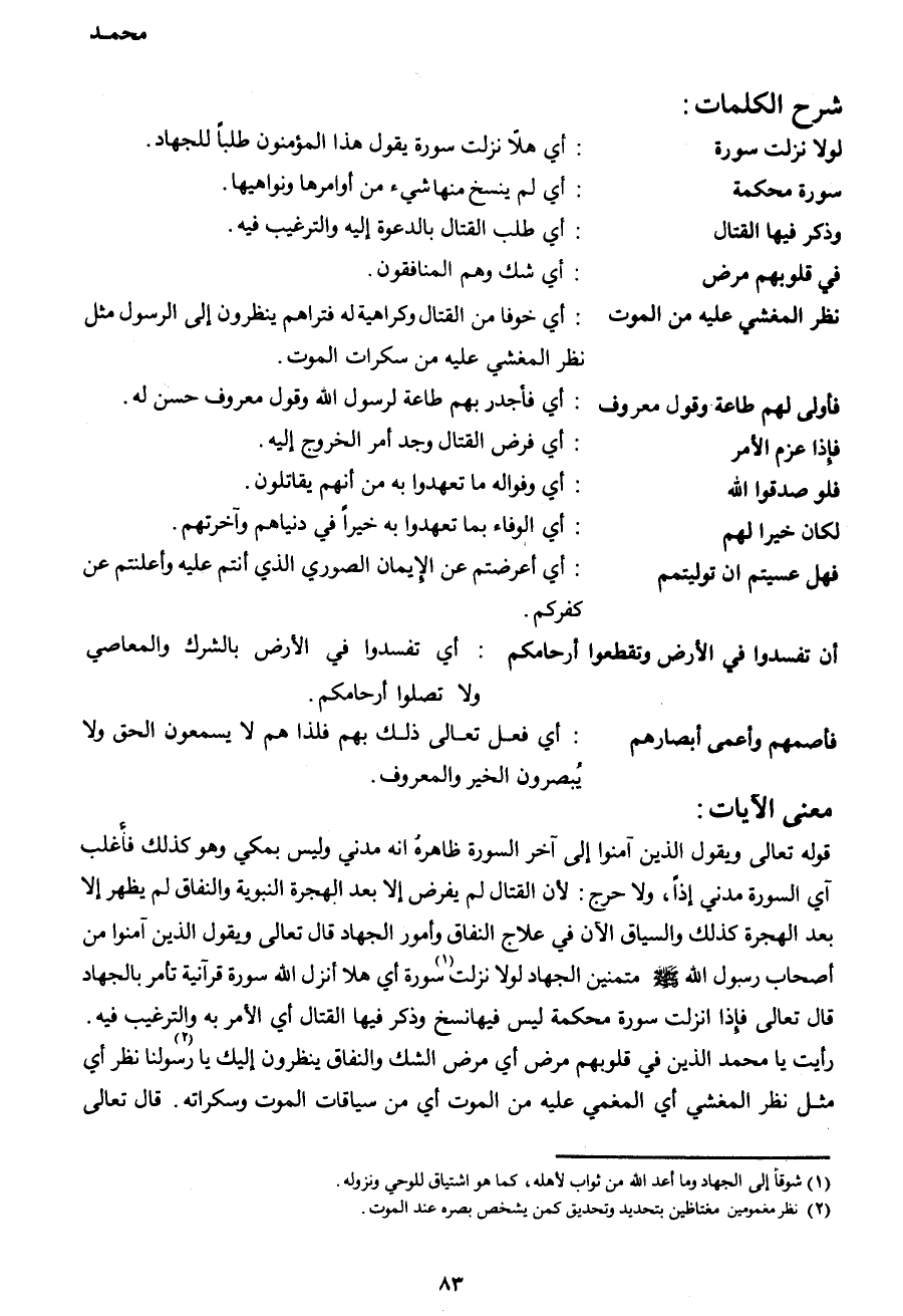 قوله تعالى ويقول الذين آمنوا إلى آخر السورة ظاهرهُ أنه مدني وليس بمكي وهو كذلك فأغلب آي السورة مدني إذاً، ولا حرج: لأن القتال لم يفرض إلا بعد الهجرة النبوية والنفاق لم يظهر إلا بعد الهجرة كذلك السياق الآن في علاج النفاق وأمور الجهاد قال تعالى ويقول الذين آمنوا من أصحاب رسول الله صَلَّى اللهُ عَلَيْهِ وَسَلَّمَ متمنين الجهاد لولا نزلت1 سورة أي هلا أنزل الله سورة قرآنية تأمر بالجهاد قال تعالى فإذا أنزلت سورة محكمة ليس فيها نسخ وذكر فيها القتال أي الأمر به والترغيب فيه. رأيت يا محمد الذين في قلوبهم مرض أي مرض الشك والنفاق ينظرون إليك يا رسولنا2 نظر أي مثل نظر المغشي أي المغمي عليه من الموت أي من سياقات الموت وسكراته. قال تعالى