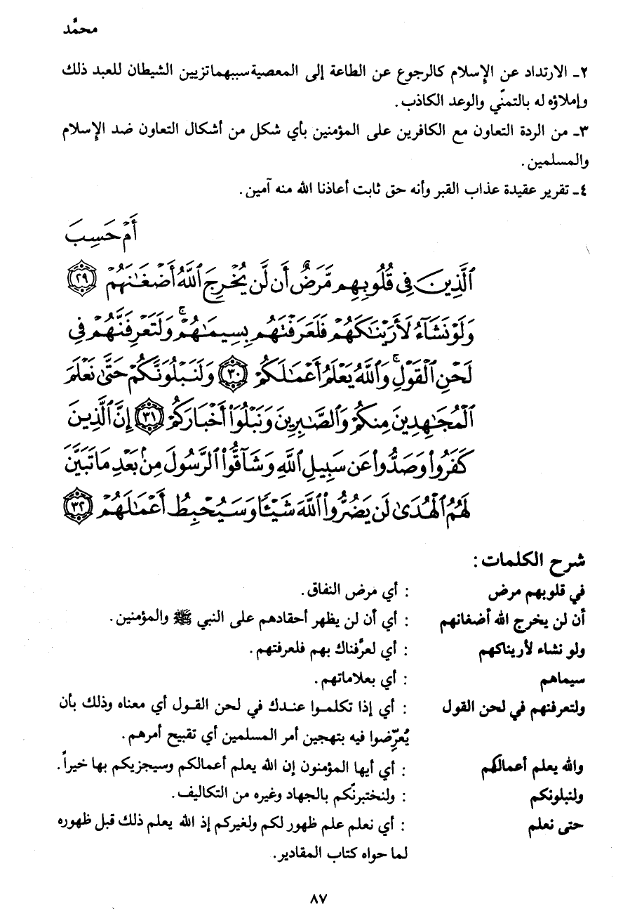 أَمْ حَسِبَ الَّذِينَ فِي قُلُوبِهِمْ مَرَضٌ أَنْ لَنْ يُخْرِجَ اللهُ أَضْغَانَهُمْ (29) وَلَوْ نَشَاءُ لَأَرَيْنَاكَهُمْ فَلَعَرَفْتَهُمْ بِسِيمَاهُمْ وَلَتَعْرِفَنَّهُمْ فِي لَحْنِ الْقَوْلِ وَاللهُ يَعْلَمُ أَعْمَالَكُمْ (30) وَلَنَبْلُوَنَّكُمْ حَتَّى نَعْلَمَ الْمُجَاهِدِينَ مِنْكُمْ وَالصَّابِرِينَ وَنَبْلُوَ أَخْبَارَكُمْ (31) إِنَّ الَّذِينَ كَفَرُوا وَصَدُّوا عَنْ سَبِيلِ اللهِ وَشَاقُّوا الرَّسُولَ مِنْ بَعْدِ مَا تَبَيَّنَ لَهُمُ الْهُدَى لَنْ يَضُرُّوا اللهَ شَيْئاً وَسَيُحْبِطُ أَعْمَالَهُمْ (32)
