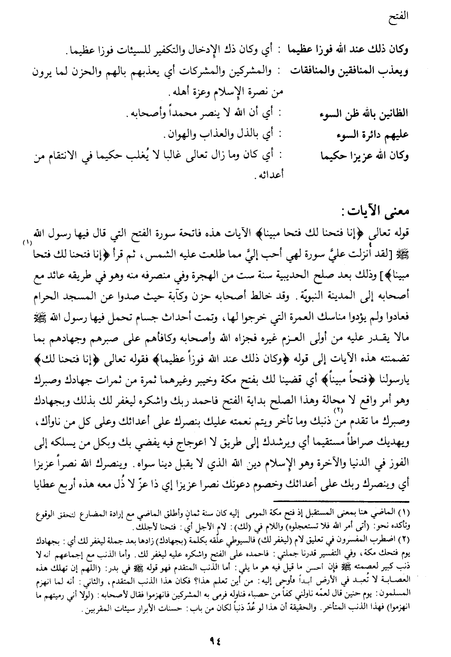 2 اضطرب المفسرون في تعليق لام (ليغفر لك) فالسيوطي علقه بكلمة (بجهادك) زادها بعد جملة ليغفر لك أي بجهادك يوم فتحك مكة، وفي التفسير قدرنا جملتي: فاحمده على الفتح واشكره عليه ليغفر لك. وأما الذنب مع إجماعهم أن لا ذنب كبير لعصمته صَلَّى اللهُ عَلَيْهِ وَسَلَّمَ فإن أحسن ما قيل فيه هو ما يلي: أما الذنب المتقدم فهو قوله صَلَّى اللهُ عَلَيْهِ وَسَلَّمَ في بدر: "اللهم إن تهلك هذه العصابة لا تعبد في الأرض أبداً" فأوحى إليه: من أين تعلم هذا؟ فكان هذا الذنب المتقدم، والثاني: أنه لما انهزم المسلمون: يوم حنين قال لعمه ناولني كفاً من حصباء فناوله فرمى به المشركين فانهزموا فقال لأصحابه: "لولا أني رميتهم ما انهزموا" فهذا الذنب المتأخر. والحقيقة أن هذا لو عد ذنباً لكان من باب: حسنات الأبرار سيئات المقربين.