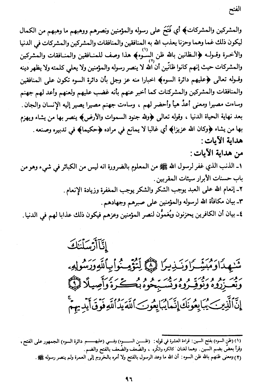 إِنَّا أَرْسَلْنَاكَ شَاهِداً وَمُبَشِّراً وَنَذِيراً (8) لِتُؤْمِنُوا بِاللهِ وَرَسُولِهِ وَتُعَزِّرُوهُ وَتُوَقِّرُوهُ وَتُسَبِّحُوهُ بُكْرَةً وَأَصِيلاً (9) إِنَّ الَّذِينَ يُبَايِعُونَكَ إِنَّمَا يُبَايِعُونَ اللهَ يَدُ اللهِ فَوْقَ أَيْدِيهِمْ