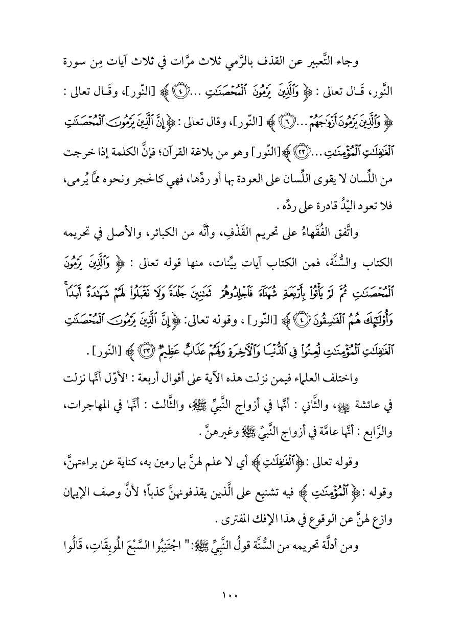 واتَّفق الفُقَهاءُ على تحريم القَذْفِ، وأنَّه من الكبائر، والأصل في تحريمه الكتاب والسُّنَّة، فمن الكتاب آيات بيِّنات، منها قوله تعالى: {وَالَّذِينَ يَرْمُونَ الْمُحْصَنَاتِ ثُمَّ لَمْ يَأْتُوا بِأَرْبَعَةِ شُهَدَاءَ فَاجْلِدُوهُمْ ثَمَانِينَ جَلْدَةً وَلَا تَقْبَلُوا لَهُمْ شَهَادَةً أَبَدًا وَأُولَئِكَ هُمُ الْفَاسِقُونَ (٤)} [النّور]، وقوله تعالى: {إِنَّ الَّذِينَ يَرْمُونَ الْمُحْصَنَاتِ الْغَافِلَاتِ الْمُؤْمِنَاتِ لُعِنُوا فِي الدُّنْيَا وَالْآخِرَةِ وَلَهُمْ عَذَابٌ عَظِيمٌ (٢٣)} [النّور].