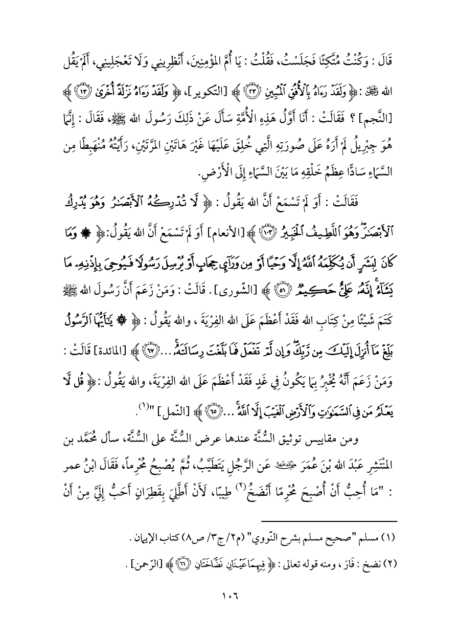 قُلْتُ مَا هُنَّ؟ قَالَتْ: مَنْ زَعَمَ أَنَّ مُحَمَّدًا - صلى الله عليه وسلم - رَأَى رَبَّهُ فَقَدْ أَعْظَمَ عَلَى الله الفِرْيَةَ، قَالَ: وَكُنْتُ مُتَّكِئًا فَجَلَسْتُ، فَقُلْتُ: يَا أُمَّ المؤْمِنِينَ، أَنْظِرِينِي وَلَا تَعْجَلِينِي، أَلَمْ يَقُلْ الله - عز وجل -: {وَلَقَدْ رَآهُ بِالْأُفُقِ الْمُبِينِ (٢٣)} [التّكوير]، {وَلَقَدْ رَآهُ نَزْلَةً أُخْرَى (١٣)} [النَّجم]؟ فَقَالَتْ: أَنَا أَوَّلُ هَذِهِ الْأُمَّةِ سَأَلَ عَنْ ذَلِكَ رَسُولَ الله - صلى الله عليه وسلم -، فَقَالَ: إِنَّمَا هُوَ جِبْرِيلُ لَمْ أَرَهُ عَلَى صُورَتِهِ الَّتِي خُلِقَ عَلَيْهَا غَيْرَ هَاتَيْنِ المرَّتَيْنِ، رَأَيْتُهُ مُنْهَبِطًا مِنْ السَّمَاءِ سَادًّا عِظَمُ خَلْقِهِ مَا بَيْنَ السَّمَاءِ إِلَى الْأَرْضِ.