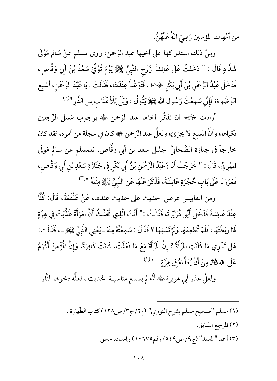 ومِنْ ذلك استدراكها على أخيها عبد الرّحمن، روى مسلم عَنْ سَالم مَوْلَى شَدَّادٍ قَالَ: " دَخَلْتُ عَلَى عَائِشَةَ زَوْجِ النَّبِيِّ - صلى الله عليه وسلم - يَوْمَ تُوُفِّيَ سَعْدُ بْنُ أَبِي وَقَّاصٍ، فَدَخَلَ عَبْدُ الرَّحْمَنِ بْنُ أَبِي بَكْرٍ - رضي الله عنهما -، فَتَوَضَّأَ عِنْدَهَا، فَقَالَتْ: يَا عَبْدَ الرَّحْمَنِ، أَسْبِغْ