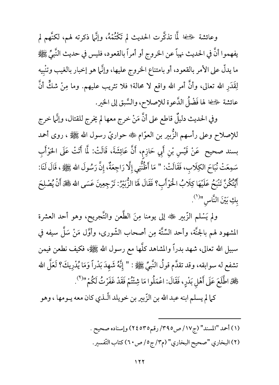 وفي الحديث دليلٌ قاطع على أنَّ مَنْ خرج معها لم يخرج للقتال، وإنَّما خرج للإصلاح وعلى رأسهم الزُّبير بن العوّام - رضي الله عنه - حواريّ رسول الله - صلى الله عليه وسلم -، روى أحمد بسند صحيح عَنْ قَيْسِ بْنِ أَبِي حَازِمٍ، أَنَّ عَائِشَةَ، قَالَتْ: لمَّا أَتَتْ عَلَى الحَوْأَبِ سَمِعَتْ نُبَاحَ الكِلَابِ، فَقَالَتْ: " مَا أَظُنُّنِي إِلَّا رَاجِعَةٌ، إِنَّ رَسُولَ الله - صلى الله عليه وسلم -، قَالَ لَنَا: " أَيَّتُكُنَّ تَنْبَحُ عَلَيْهَا كِلَابُ الْحَوْأَبِ؟ فَقَالَ لَهَا الزُّبَيْرُ: تَرْجِعِينَ عَسَى الله - عز وجل - أَنْيُصْلِحَ بِكِ بَيْنَ النَّاسِ" (¬١).