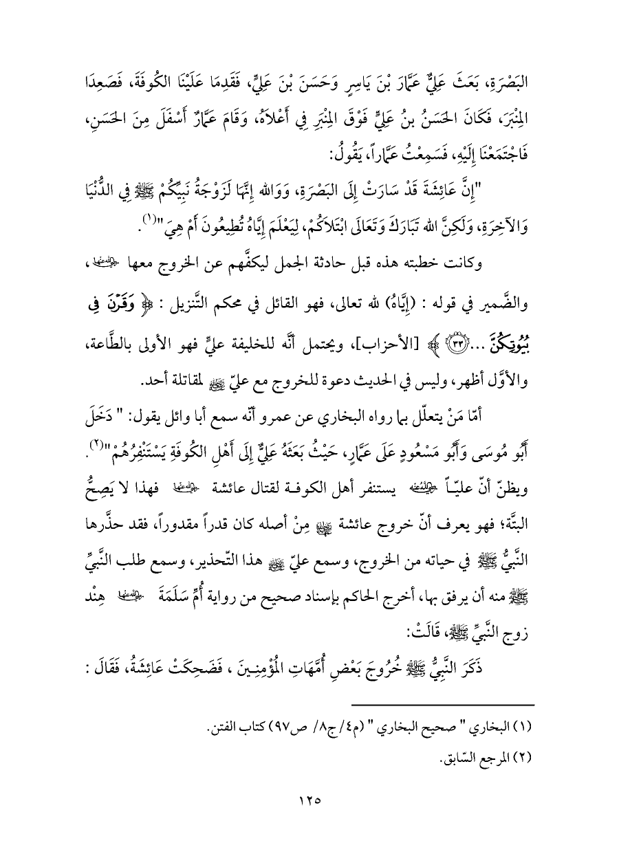 أمّا مَنْ يتعلّل بما رواه البخاري عن عمرو أنّه سمع أبا وائل يقول: " دَخَلَ أَبُو مُوسَى وَأَبُو مَسْعُودٍ عَلَى عَمَّارٍ، حَيْثُ بَعَثَهُ عَلِيٌّ إِلَى أَهْلِ الكُوفَةِ يَسْتَنْفِرُهُمْ " (¬٢). ويظنّ أنّ علياً - رضي الله عنه - يستنفر أهل الكوفة لقتال عائشة - رضي الله عنها - فهذا لا يَصِحُّ البتَّة؛ فهو يعرف أنّ خروج عائشة - رضي الله عنها - مِنْ أصله كان قدراً مقدوراً، فقد حذَّرها النَّبيُّ - صلى الله عليه وسلم - في حياته من الخروج، وسمع عليّ - رضي الله عنه - هذا التّحذير، وسمع طلب النَّبيِّ - صلى الله عليه وسلم - منه أن يرفق بها، أخرج الحاكم بإسناد صحيح من رواية أُمِّ سَلَمَةَ - رضي الله عنها - هِنْد زوج النَّبيِّ - صلى الله عليه وسلم -، قَالَتْ:
