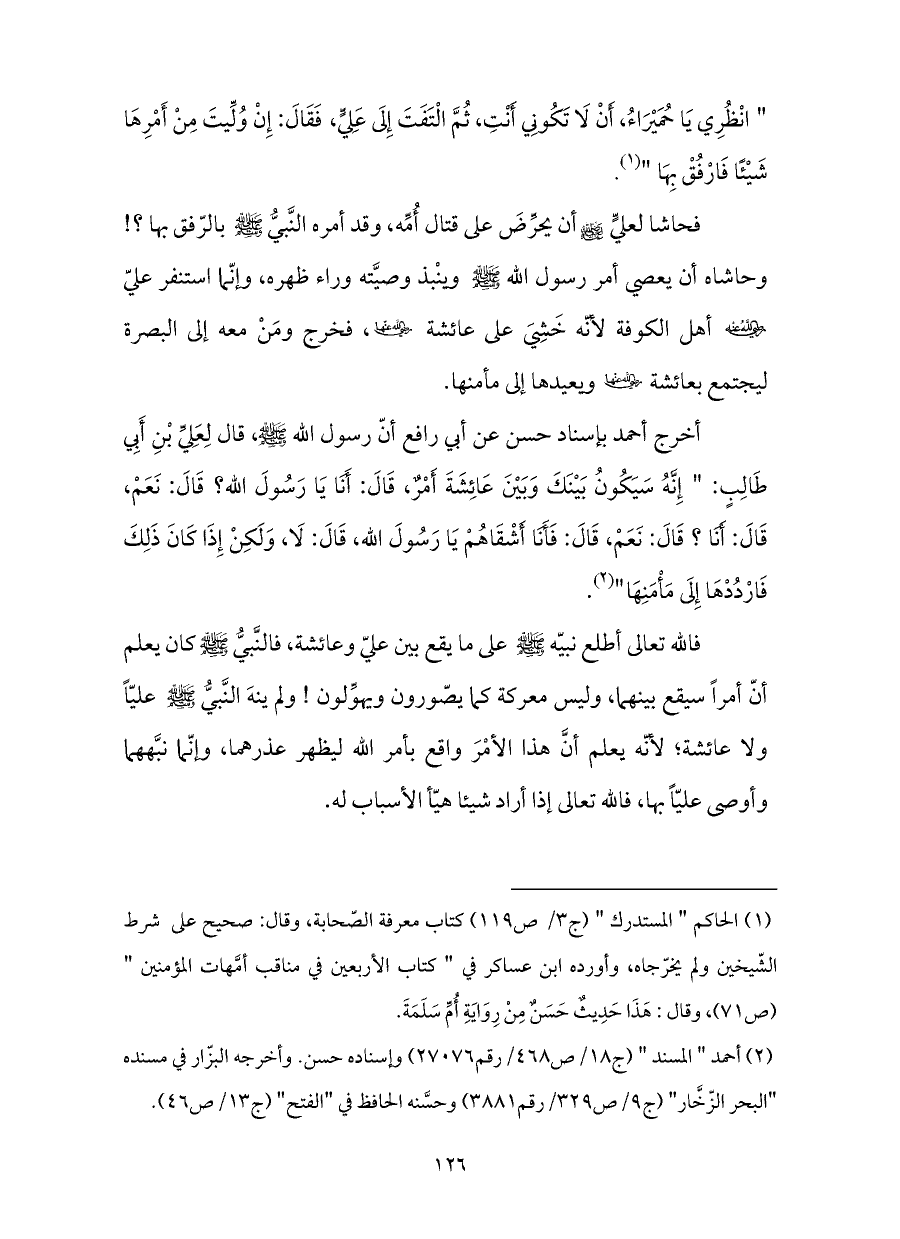 أخرج أحمد بإسناد حسن عن أبي رافع أنّ رسول الله - صلى الله عليه وسلم -، قال لِعَلِيِّ بْنِ أَبِي طَالِبٍ: " إِنَّهُ سَيَكُونُ بَيْنَكَ وَبَيْنَ عَائِشَةَ أَمْرٌ، قَالَ: أَنَا يَا رَسُولَ الله؟ قَالَ: نَعَمْ، قَالَ: أَنَا؟ قَالَ: نَعَمْ، قَالَ: فَأَنَا أَشْقَاهُمْ يَا رَسُولَ الله، قَالَ: لَا، وَلَكِنْ إِذَا كَانَ ذَلِكَ فَارْدُدْهَا إِلَى مَأْمَنِهَا" (¬٢).