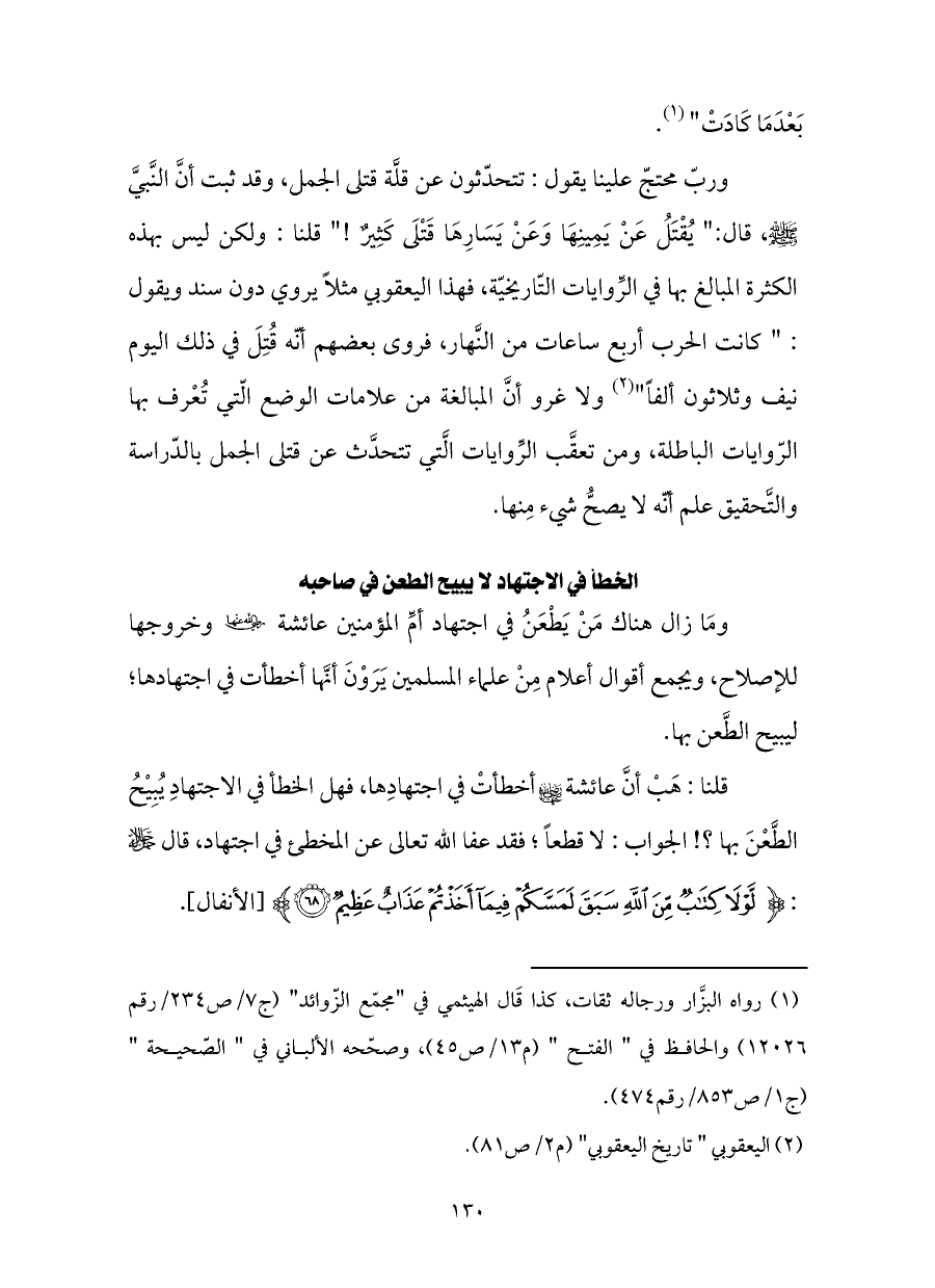 وربّ محتجّ علينا يقول: تتحدّثون عن قلَّة قتلى الجمل، وقد ثبت أنَّ النَّبيَّ - صلى الله عليه وسلم -، قال: "يُقْتَلُ عَنْ يَمِينِهَا وَعَنْ يَسَارِهَا قَتْلَى كَثِيرٌ! " قلنا: ولكن ليس بهذه الكثرة المبالغ بها في الرِّوايات التّاريخيّة، فهذا اليعقوبي مثلاً يروي دون سند ويقول: " كانت الحرب أربع ساعات من النَّهار، فروى بعضهم أنّه قُتِلَ في ذلك اليوم نيف وثلاثون ألفاً" (¬٢) ولا غرو أنَّ المبالغة من علامات الوضع الّتي تُعرف بها الرّوايات الباطلة، ومن تعقَّب الرِّوايات الَّتي تتحدَّث عن قتلى الجمل بالدّراسة والتَّحقيق علم أنّه لا يصحُّ شيء مِنها.
