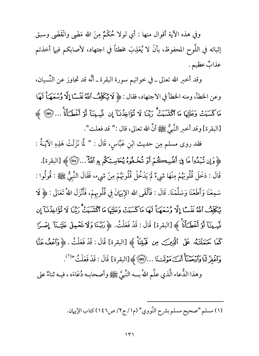 وقد أخبر الله تعالى ـ في خواتيم سورة البقرة ـ أنَّه قد تجاوز عن النِّسيان، وعن الخطأ، ومنه الخطأ في الاجتهاد، فقال: {لَا يُكَلِّفُ اللَّهُ نَفْسًا إِلَّا وُسْعَهَا لَهَا مَا كَسَبَتْ وَعَلَيْهَا مَا اكْتَسَبَتْ رَبَّنَا لَا تُؤَاخِذْنَا إِنْ نَسِينَا أَوْ أَخْطَأْنَا (٢٨٦)} [البقرة] وقد أخبر النَّبيُّ - صلى الله عليه وسلم - أنَّ الله تعالى، قال: " قد فعلت".