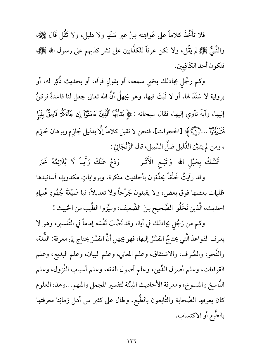 وكم رجُلٍ يجادلك بخبرٍ سمعه، أو بقولٍ قرأه، أو بحديث ذُكِر له، أو برواية لا سَنَدَ لها، أو لا ثَبْتَ فيها، وهو يجهلُ أنَّ الله تعالى جعل لنا قاعدةً نركنُ إليها، وآيةً نأوي إليها، فقال سبحانه: {يَاأَيُّهَا الَّذِينَ آمَنُوا إِنْ جَاءَكُمْ فَاسِقٌ بِنَبَإٍ فَتَبَيَّنُوا (٦)} [الحجرات]، فنحن لا نقبل كلاماً إلَّا بدليل جَازِم وبرهان حَازِم، ومن لم يتبيَّن الدَّليل ضلَّ السَّبيل، قال الزَّنْجَانِيّ: