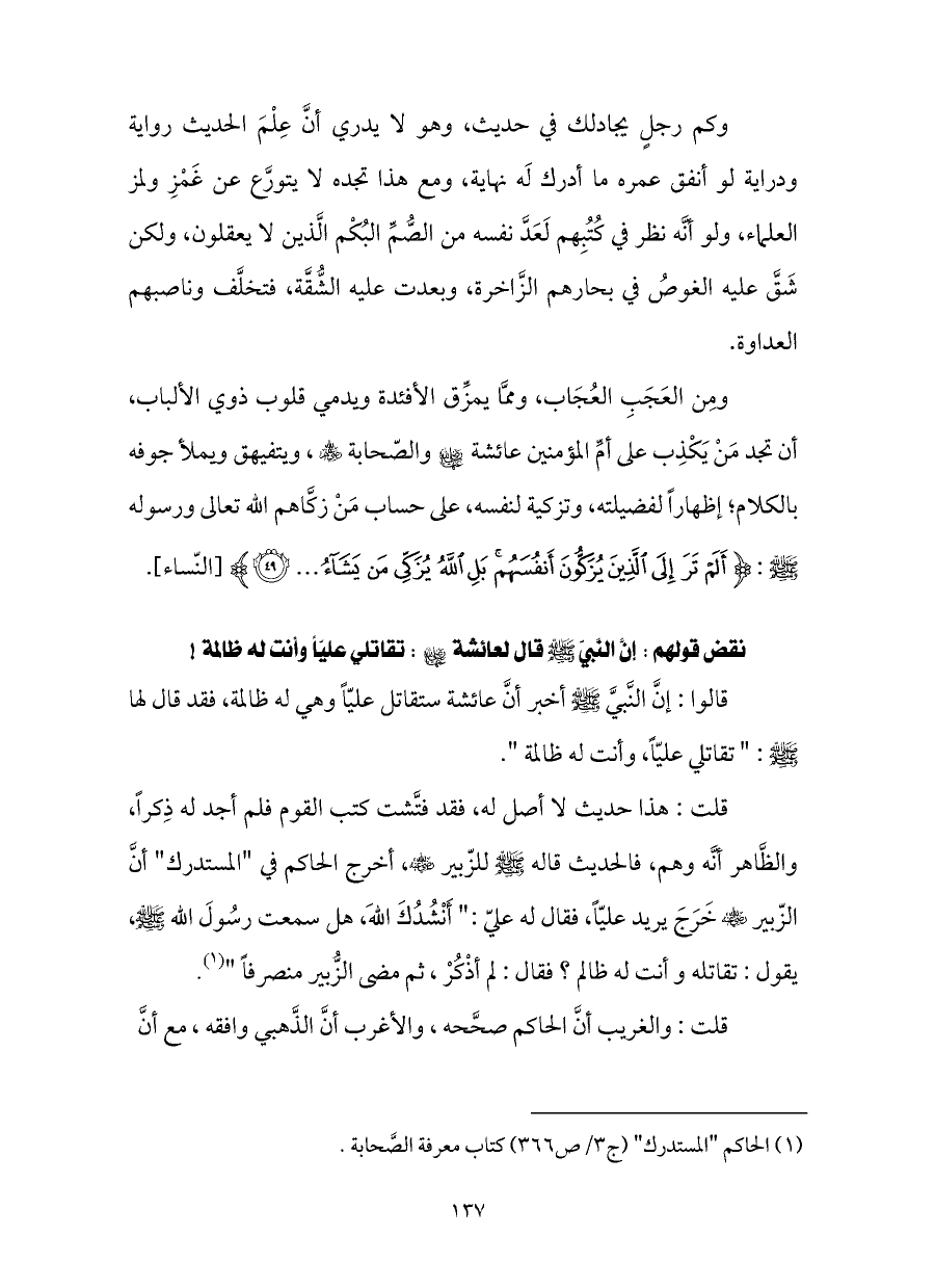 نقض قولهم: إنَّ النَّبيّ - صلى الله عليه وسلم - قال لعائشة - رضي الله عنها -: تقاتلي عليّاً وأنت له ظالمة!