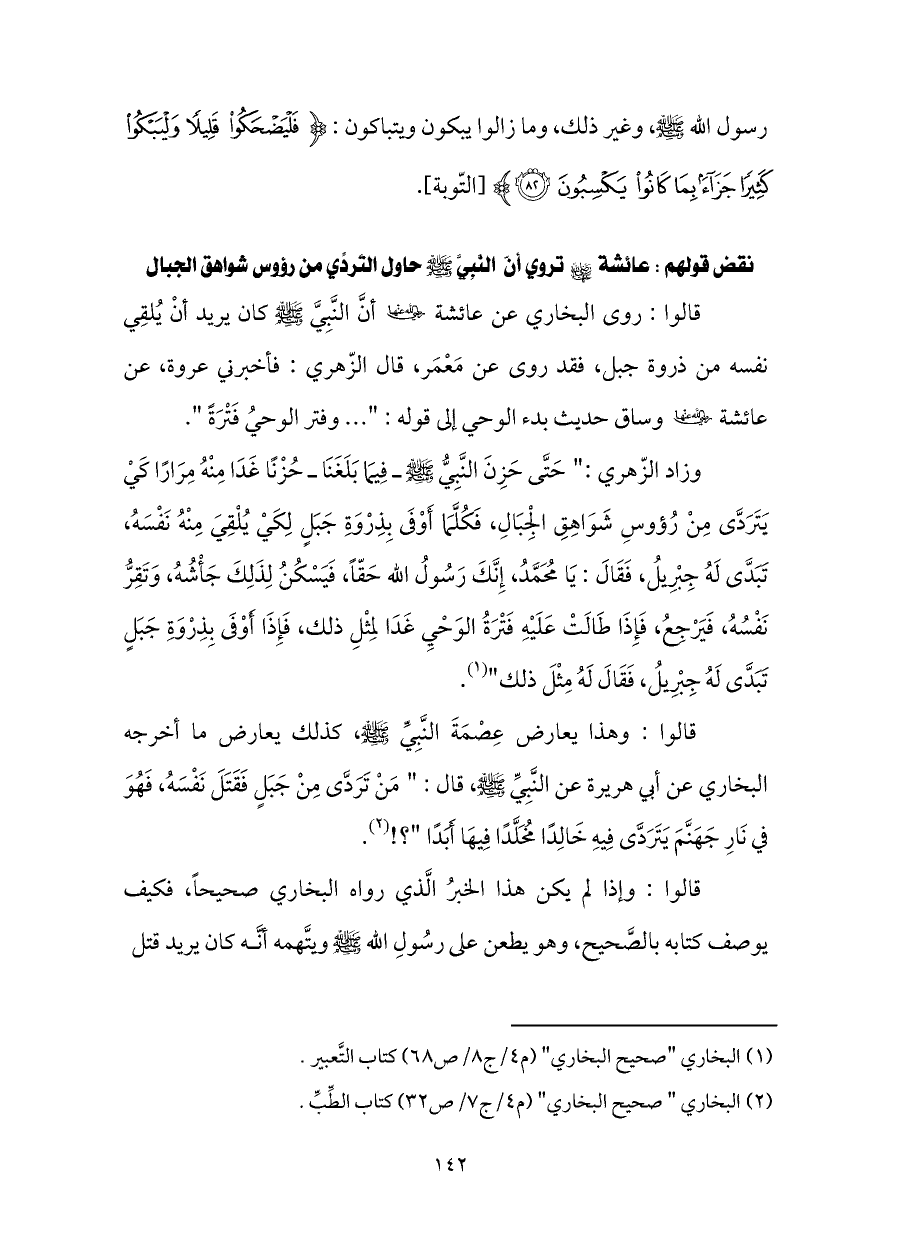 نقض قولهم: عائشة - رضي الله عنها - تروي أنّ النَّبِيَّ - صلى الله عليه وسلم - حاول التَّردِّي من رؤوس شواهق الجبال