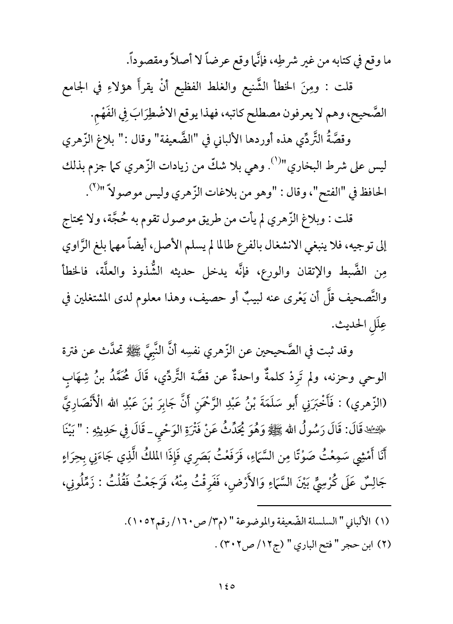قلت: وبلاغ الزّهري لم يأت من طريق موصول تقوم به حُجَّة، ولا يحتاج إلى توجيه، فلا ينبغي الانشغال بالفرع طالما لم يسلم الأصل، أيضاً مهما بلغ الرَّاوي مِن الضَّبط والإتقان والورع، فإنَّه يدخل حديثه الشُّذوذ والعلَّة، فالخطأ والتَّصحيف قلَّ أن يَعْرى عنه لبيبٌ أو حصيف، وهذا معلوم لدى المشتغلين في عِلَلِ الحديث.