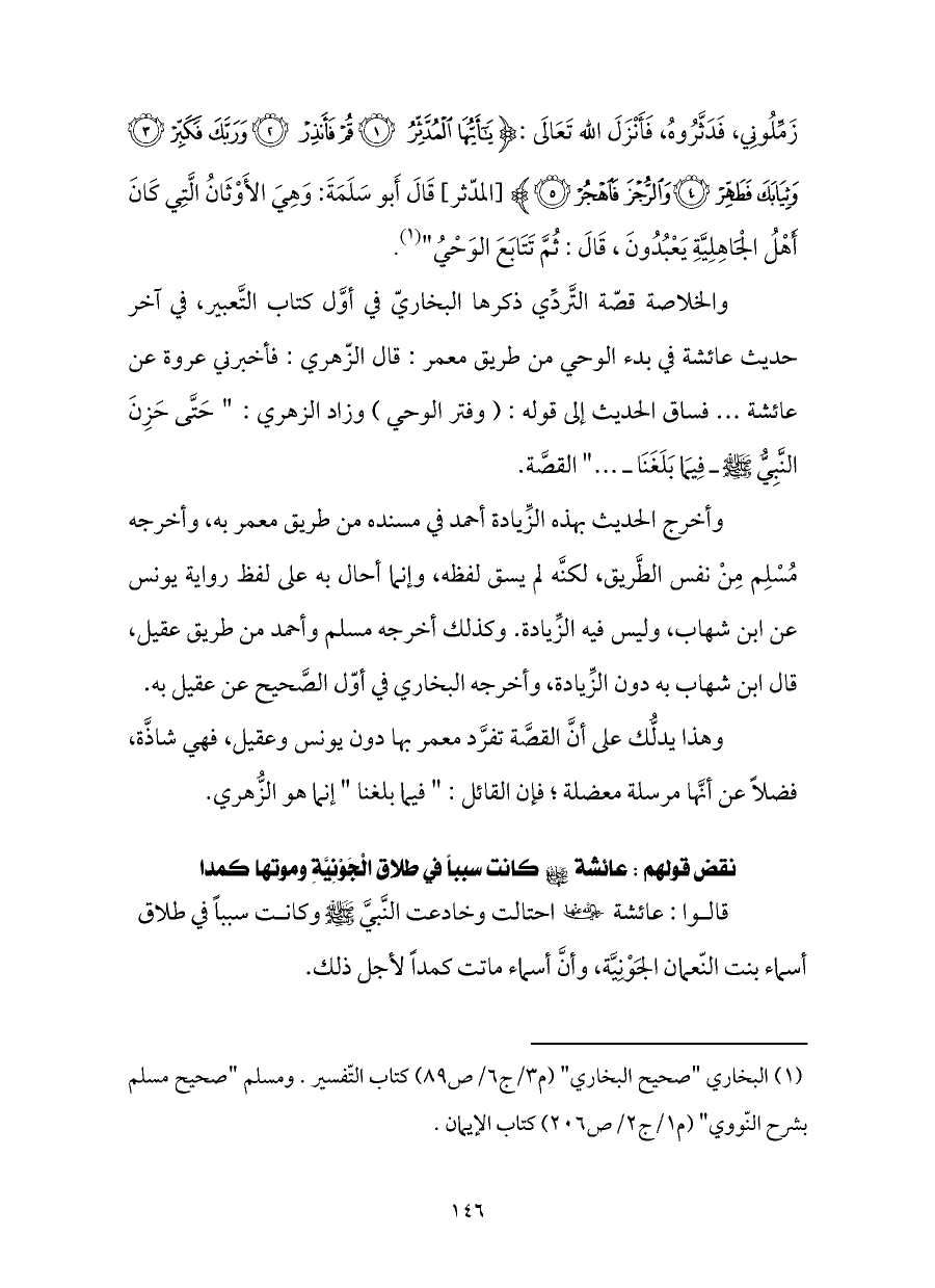 والخلاصة قصّة التَّردِّي ذكرها البخاريّ في أوَّل كتاب التَّعبير، في آخر حديث عائشة في بدء الوحي من طريق معمر: قال الزّهري: فأخبرني عروة عن عائشة. . . فساق الحديث إلى قوله: (وفتر الوحي) وزاد الزهري: " حَتَّى حَزِنَ النَّبِيُّ - صلى الله عليه وسلم - ـ فِيمَا بَلَغَنَا ـ " القصَّة.