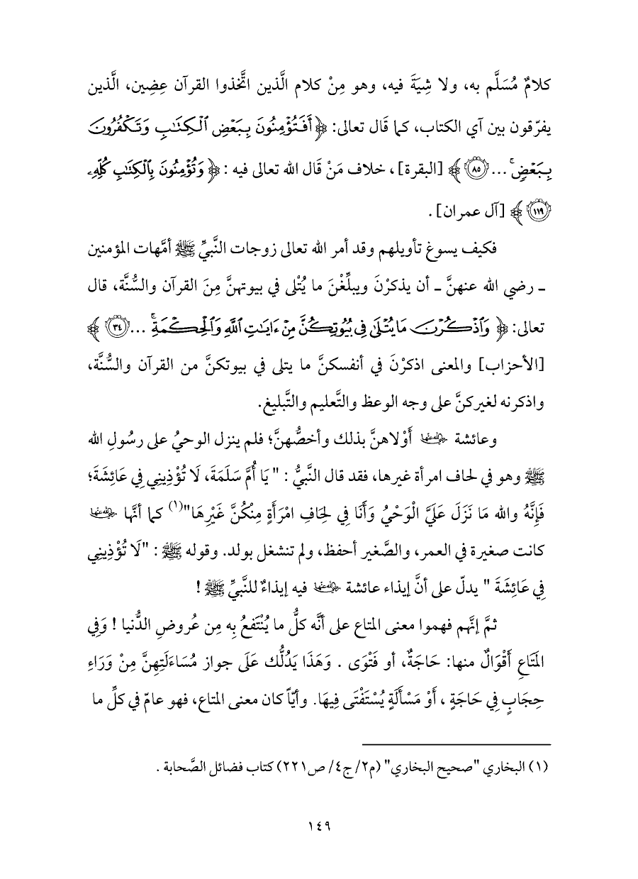 كلامٌ مُسَلَّم به، ولا شِيَةَ فيه، وهو مِنْ كلام الَّذين اتَّخذوا القرآن عِضِين، الَّذين يفرّقون بين آي الكتاب، كما قَال تعالى: {أَفَتُؤْمِنُونَ بِبَعْضِ الْكِتَابِ وَتَكْفُرُونَ بِبَعْضٍ (٨٥)} [البقرة]، خلاف مَنْ قَال الله تعالى فيه: {وَتُؤْمِنُونَ بِالْكِتَابِ كُلِّهِ (١١٩)} [آل عمران]. فكيف يسوغ تأويلهم وقد أمر الله تعالى زوجات النَّبيِّ - صلى الله عليه وسلم - أمَّهات المؤمنين ـ رضي الله عنهنَّ ـ أن يذكرْنَ ويبلِّغْنَ ما يُتْلى في بيوتهنَّ مِنَ القرآن والسُّنَّة، قال تعالى: {وَاذْكُرْنَ مَا يُتْلَى فِي بُيُوتِكُنَّ مِنْ آيَاتِ اللَّهِ وَالْحِكْمَةِ (٣٤)} [الأحزاب] والمعنى اذكرْنَ في أنفسكنَّ ما يتلى في بيوتكنَّ من القرآن والسُّنَّة، واذكرنه لغيركنَّ على وجه الوعظ والتَّعليم والتَّبليغ.