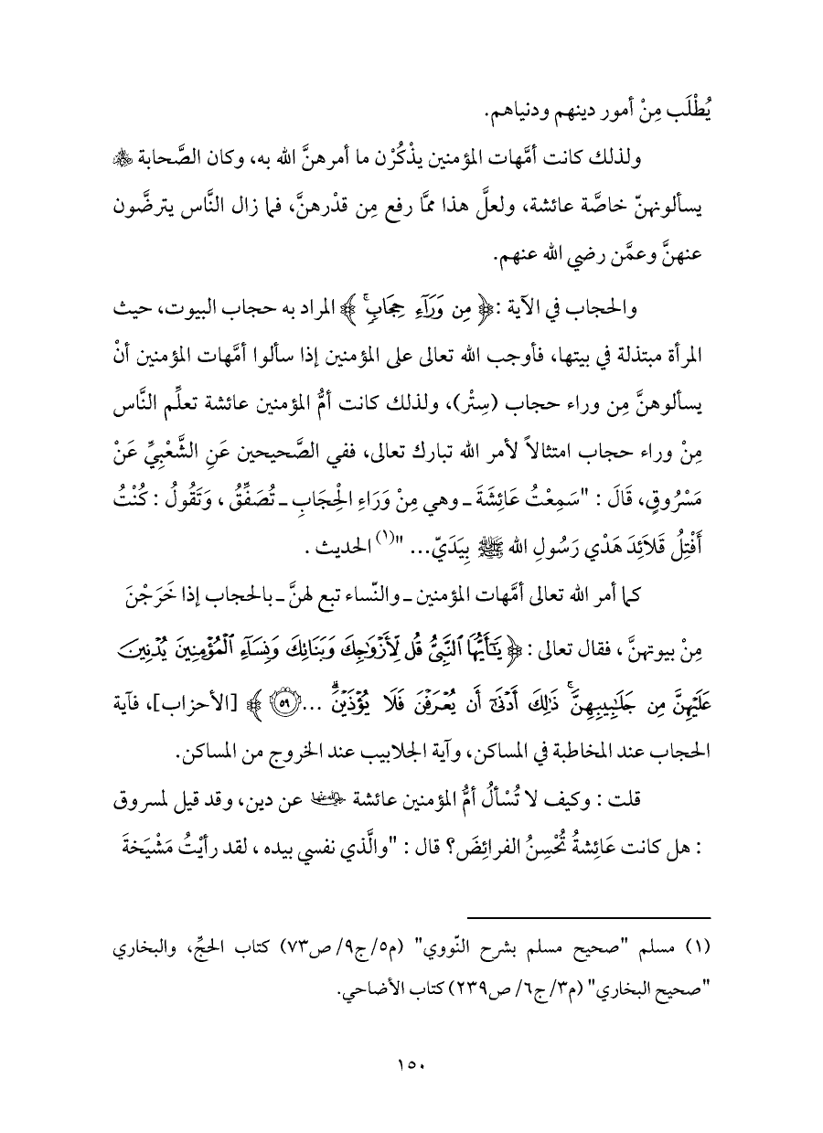والحجاب في الآية: {مِنْ وَرَاءِ حِجَابٍ} المراد به حجاب البيوت، حيث المرأة مبتذلة في بيتها، فأوجب الله تعالى على المؤمنين إذا سألوا أمَّهات المؤمنين أنْ يسألوهنَّ مِن وراء حجاب (سِتْر)، ولذلك كانت أمُّ المؤمنين عائشة تعلِّم النَّاس مِنْ وراء حجاب امتثالاً لأمر الله تبارك تعالى، ففي الصَّحيحين عَنِ الشَّعْبِيِّ عَنْ مَسْرُوقٍ، قَالَ: "سَمِعْتُ عَائِشَةَ ـ وهي مِنْ وَرَاءِ الْحِجَابِ ـ تُصَفِّقُ، وَتَقُولُ: كُنْتُ أَفْتِلُ قَلَائِدَ هَدْي رَسُولِ الله - صلى الله عليه وسلم - بِيَدَيّ " (¬١) الحديث.