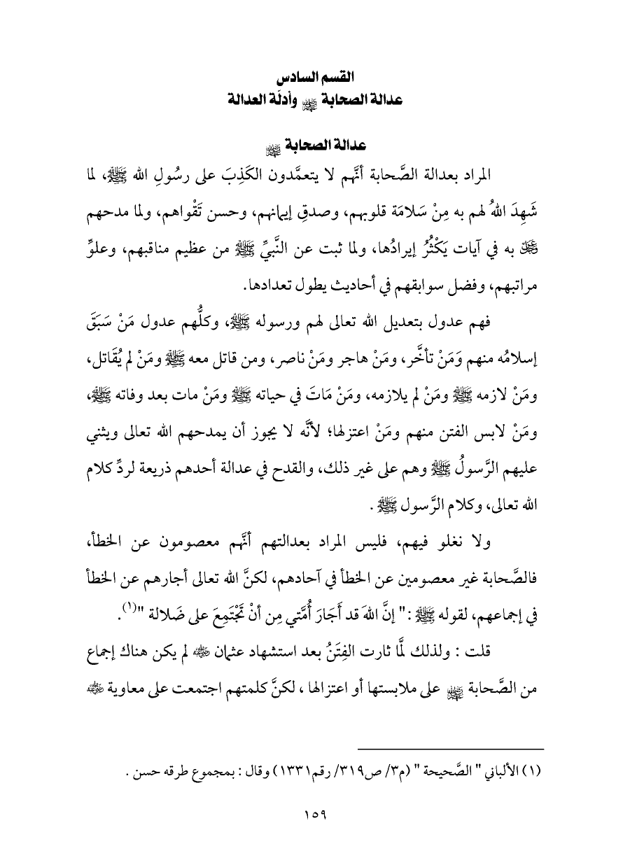 ولا نغلو فيهم، فليس المراد بعدالتهم أنَّهم معصومون عن الخطأ، فالصَّحابة غير معصومين عن الخطأ في آحادهم، لكنَّ الله تعالى أجارهم عن الخطأ في إجماعهم، لقوله - صلى الله عليه وسلم -: "إنَّ اللهَ قد أَجَارَ أُمَّتي مِن أنْ تَجْتَمِعَ على ضَلالة " (¬١).