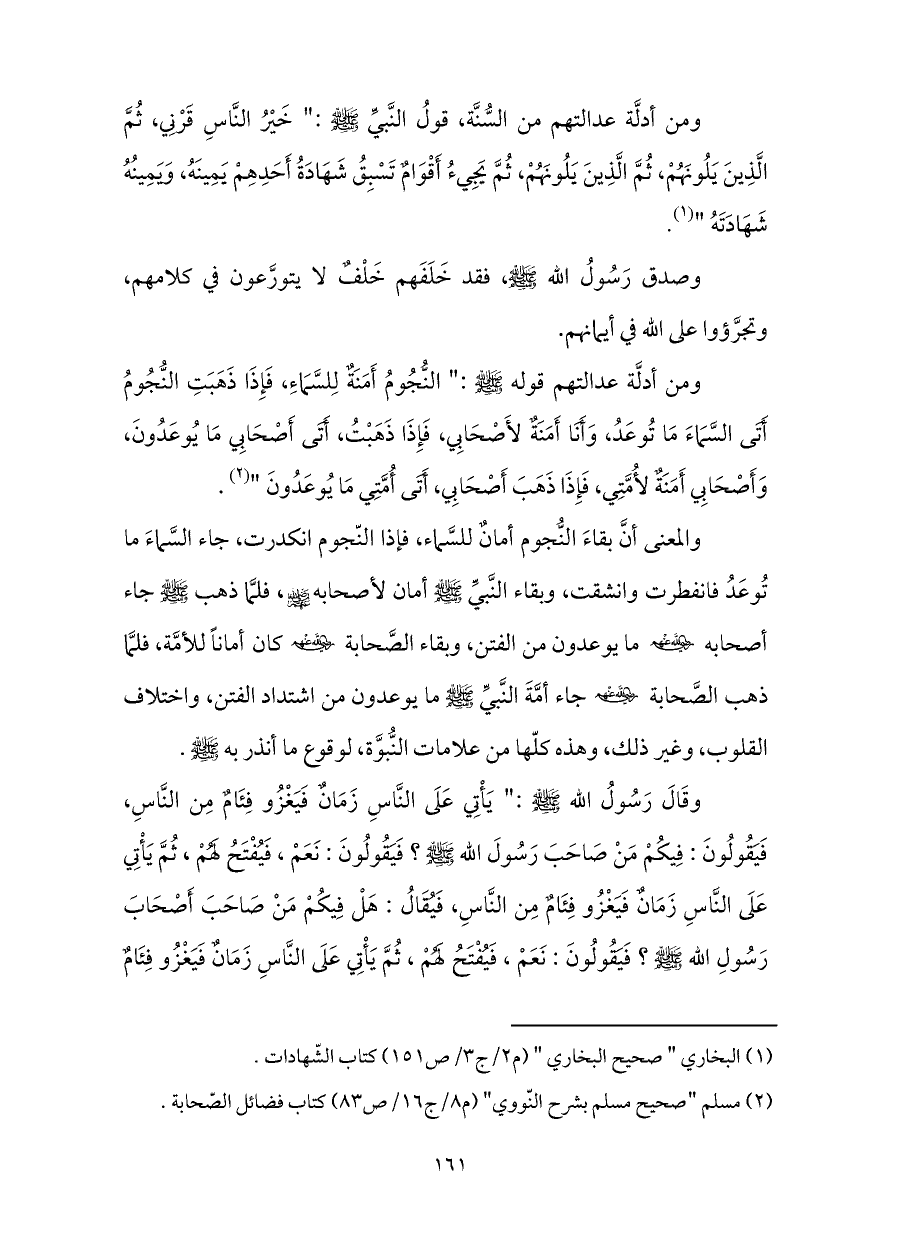 ومن أدلَّة عدالتهم قوله - صلى الله عليه وسلم -: "النُّجُومُ أَمَنَةٌ لِلسَّمَاءِ، فَإِذَا ذَهَبَتِ النُّجُومُ أَتَى السَّمَاءَ مَا تُوعَدُ، وَأَنَا أَمَنَةٌ لأَصْحَابِي، فَإِذَا ذَهَبْتُ، أَتَى أَصْحَابِي مَا يُوعَدُونَ، وَأَصْحَابِي أَمَنَةٌ لأُمَّتِي، فَإِذَا ذَهَبَ أَصْحَابِي، أَتَى أُمَّتِي مَا يُوعَدُونَ " (¬٢).