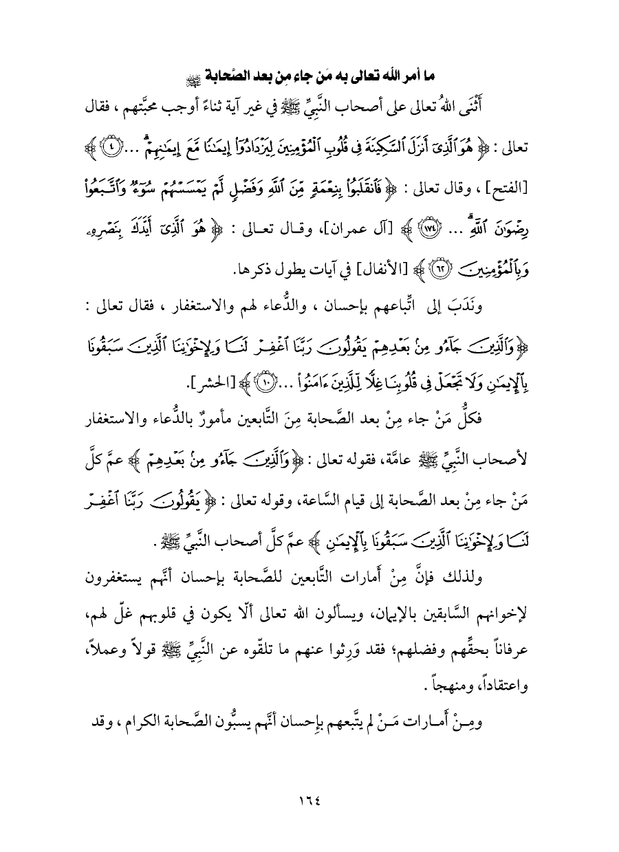 ونَدَبَ إلى اتِّباعهم بإحسان، والدُّعاء لهم والاستغفار، فقال تعالى: {وَالَّذِينَ جَاءُوا مِنْ بَعْدِهِمْ يَقُولُونَ رَبَّنَا اغْفِرْ لَنَا وَلِإِخْوَانِنَا الَّذِينَ سَبَقُونَا بِالْإِيمَانِ وَلَا تَجْعَلْ فِي قُلُوبِنَا غِلًّا لِلَّذِينَ آمَنُوا (١٠)} [الحشر].