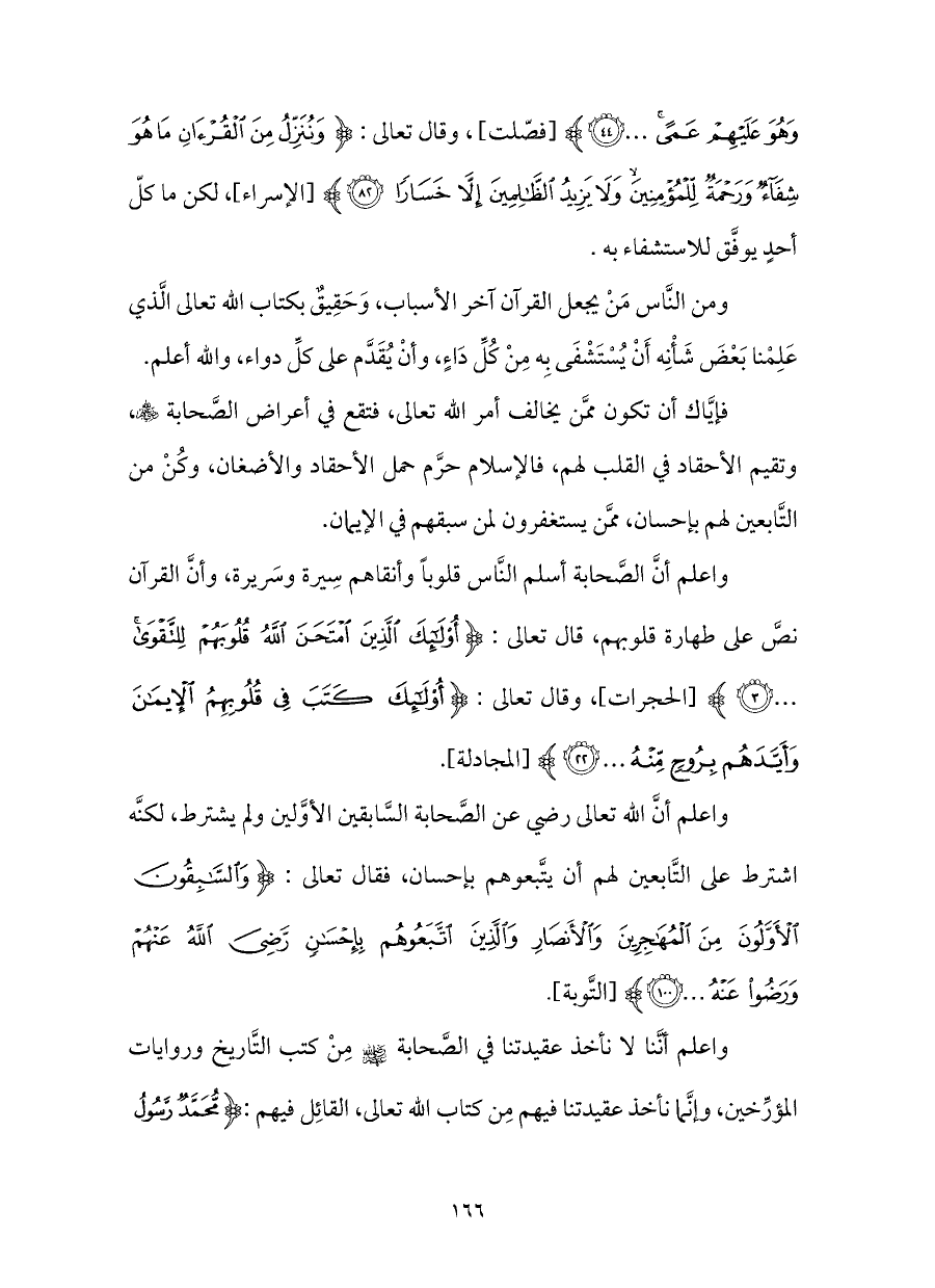 واعلم أنَّ الله تعالى رضي عن الصَّحابة السَّابقين الأوَّلين ولم يشترط، لكنَّه اشترط على التَّابعين لهم أن يتَّبعوهم بإحسان، فقال تعالى: {وَالسَّابِقُونَ الْأَوَّلُونَ مِنَ الْمُهَاجِرِينَ وَالْأَنْصَارِ وَالَّذِينَ اتَّبَعُوهُمْ بِإِحْسَانٍ رَضِيَ اللَّهُ عَنْهُمْ وَرَضُوا عَنْهُ (١٠٠)} [التَّوبة].