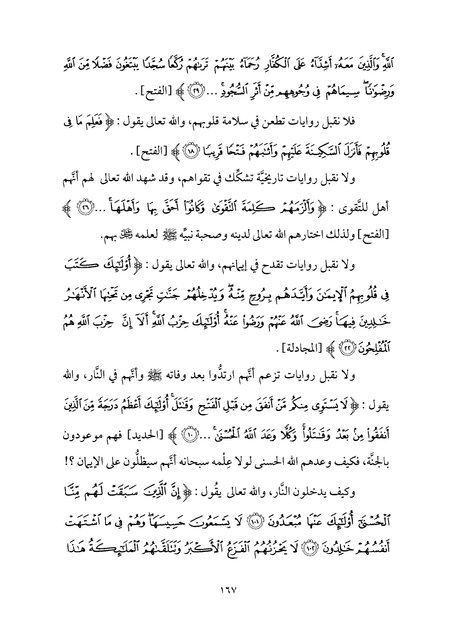 ولا نقبل روايات تزعم أنَّهم ارتدُّوا بعد وفاته - صلى الله عليه وسلم - وأنَّهم في النَّار، والله يقول: {لَا يَسْتَوِي مِنْكُمْ مَنْ أَنْفَقَ مِنْ قَبْلِ الْفَتْحِ وَقَاتَلَ أُولَئِكَ أَعْظَمُ دَرَجَةً مِنَ الَّذِينَ أَنْفَقُوا مِنْ بَعْدُ وَقَاتَلُوا وَكُلًّا وَعَدَ اللَّهُ الْحُسْنَى (١٠)} [الحديد] فهم موعودون بالجنَّة، فكيف وعدهم الله الحسنى لولا عِلْمه سبحانه أنَّهم سيظلُّون على الإيمان؟!