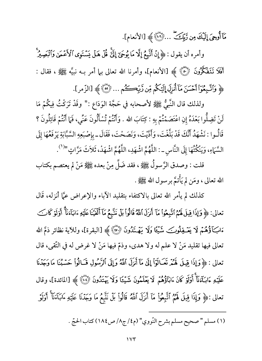 وأمره أن يقول: {إِنْ أَتَّبِعُ إِلَّا مَا يُوحَى إِلَيَّ قُلْ هَلْ يَسْتَوِي الْأَعْمَى وَالْبَصِيرُ أَفَلَا تَتَفَكَّرُونَ (٥٠)} [الأنعام]، وأمرنا الله تعالى بما أمر به نبيَّه - صلى الله عليه وسلم -، فقال: {وَاتَّبِعُوا أَحْسَنَ مَا أُنْزِلَ إِلَيْكُمْ مِنْ رَبِّكُمْ (٥٥)} [الزّمر].