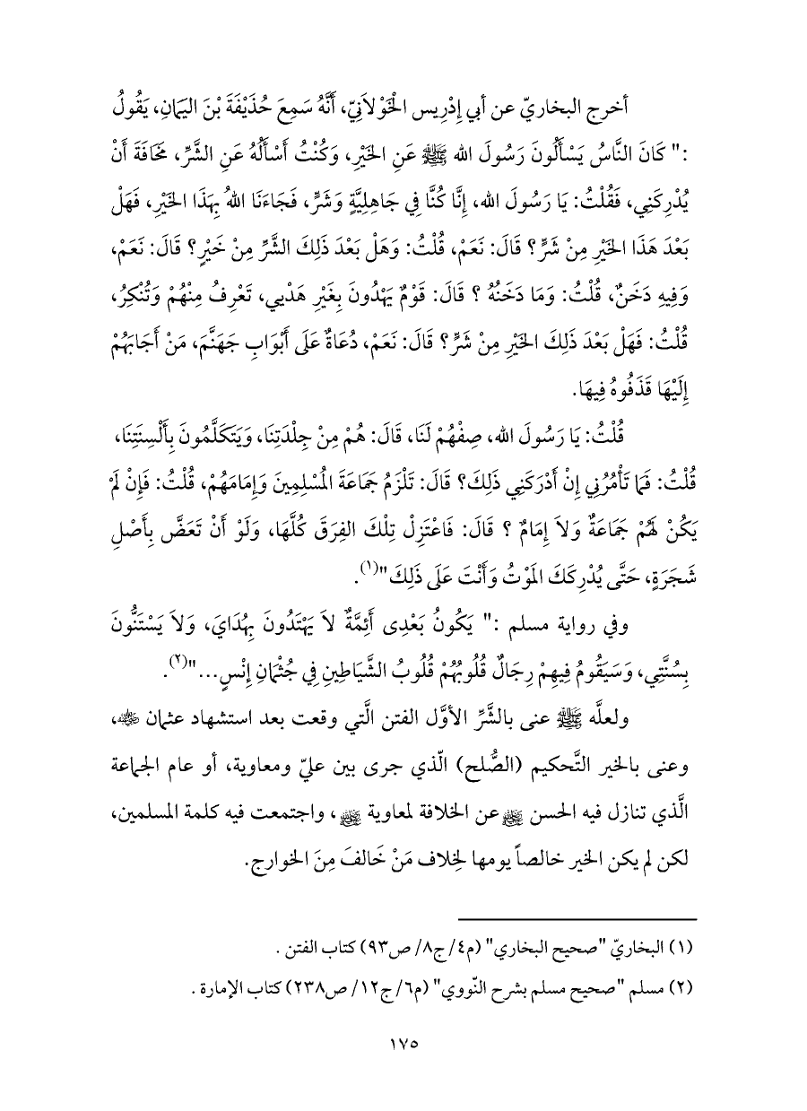 " كَانَ النَّاسُ يَسْأَلُونَ رَسُولَ الله - صلى الله عليه وسلم - عَنِ الخَيْرِ، وَكُنْتُ أَسْأَلُهُ عَنِ الشَّرِّ، مَخَافَةَ أَنْ يُدْرِكَنِي، فَقُلْتُ: يَا رَسُولَ الله، إِنَّا كُنَّا فِي جَاهِلِيَّةٍ وَشَرٍّ، فَجَاءَنَا اللهُ بِهَذَا الخَيْرِ، فَهَلْ بَعْدَ هَذَا الخَيْرِ مِنْ شَرٍّ؟ قَالَ: نَعَمْ، قُلْتُ: وَهَلْ بَعْدَ ذَلِكَ الشَّرِّ مِنْ خَيْرٍ؟ قَالَ: نَعَمْ، وَفِيهِ دَخَنٌ، قُلْتُ: وَمَا دَخَنُهُ؟ قَالَ: قَوْمٌ يَهْدُونَ بِغَيْرِ هَدْيي، تَعْرِفُ مِنْهُمْ وَتُنْكِرُ، قُلْتُ: فَهَلْ بَعْدَ ذَلِكَ الخَيْرِ مِنْ شَرٍّ؟ قَالَ: نَعَمْ، دُعَاةٌ عَلَى أَبْوَابِ جَهَنَّمَ، مَنْ أَجَابَهُمْ إِلَيْهَا قَذَفُوهُ فِيهَا.