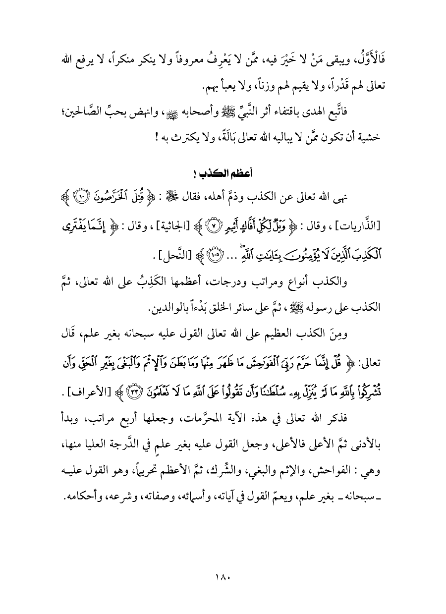 فذكر الله تعالى في هذه الآية المحرَّمات، وجعلها أربع مراتب، وبدأ بالأدنى ثمَّ الأعلى فالأعلى، وجعل القول عليه بغير علمٍ في الدَّرجة العليا منها، وهي: الفواحش، والإثم والبغي، والشِّرك، ثمَّ الأعظم تحريماً، وهو القول عليه ـ سبحانه ـ بغير علم، ويعمّ القول في آياته، وأسمائه، وصفاته، وشرعه، وأحكامه.