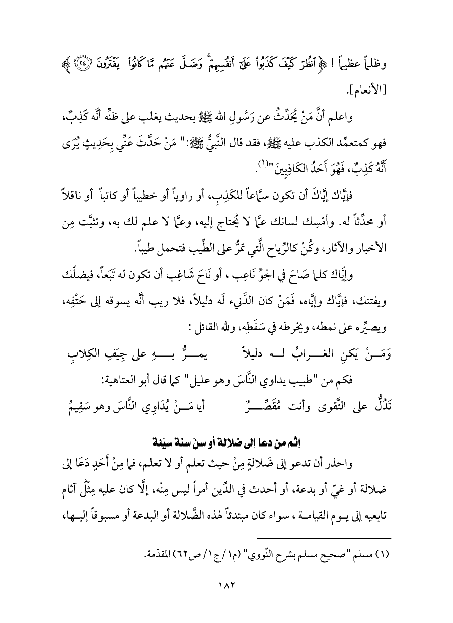 واعلم أنَّ من يُحَدِّثُ عن رَسُولِ الله - صلى الله عليه وسلم - بحديث يغلب على ظنِّه أنَّه كَذِبٌ، فهو كمتعمِّد الكذب عليه - صلى الله عليه وسلم -، فقد قال النَّبيُّ - صلى الله عليه وسلم -: "مَنْ حَدَّثَ عَنِّي بِحَدِيثٍ يُرَى أَنَّهُ كَذِبٌ، فَهُوَ أَحَدُ الكَاذِبِينَ" (¬١).