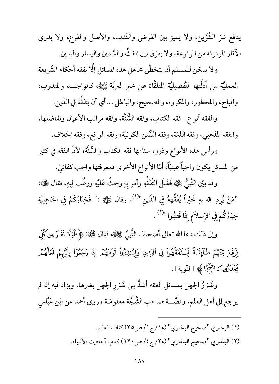 وضَرَرُ الجهل بمسائل الفقه أشدُّ مِن ضَرَرِ الجهل بغيرها، ويزاد فيه إذا لم يرجع إلى أهل العلم، وقصَّة صاحب الشَّجَّة معلومَة، روى أحمد عن ابْن عَبَّاسٍ