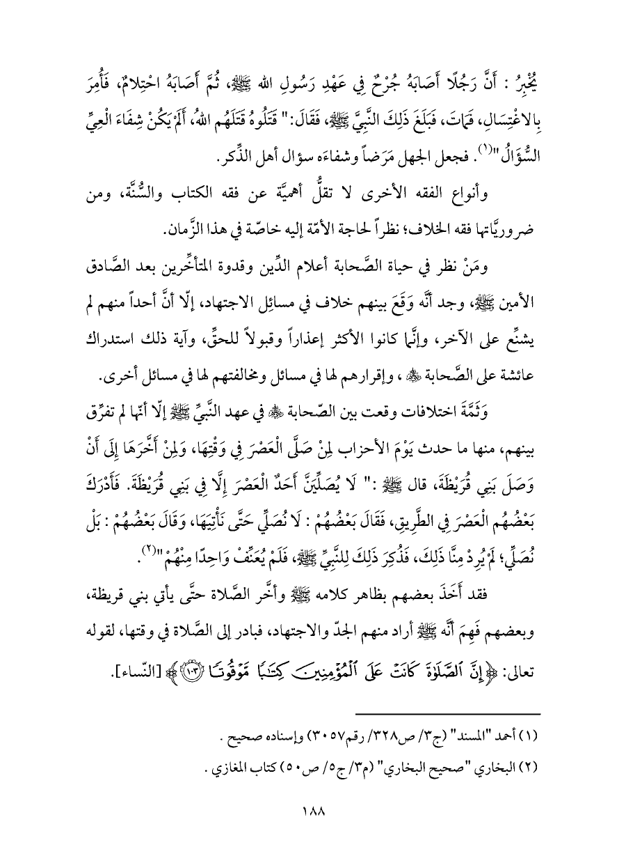 وَثَمَّةَ اختلافات وقعت بين الصّحابة - رضي الله عنهم - في عهد النَّبيِّ - صلى الله عليه وسلم - إلّا أنّها لم تفرِّق بينهم، منها ما حدث يَوْمَ الأحزاب لِمنْ صَلَّى الْعَصْرَ فِي وَقْتِهَا، وَلِمنْ أَخَّرَهَا إِلَى أَنْ وَصَلَ بَنِي قُرَيْظَةَ، قال - صلى الله عليه وسلم -: "لَا يُصَلِّيَنَّ أَحَدٌ الْعَصْرَ إِلَّا فِي بَنِي قُرَيْظَةَ. فَأَدْرَكَ بَعْضُهُمْ الْعَصْرَ فِي الطَّرِيقِ، فَقَالَ بَعْضُهُمْ: لَا نُصَلِّي حَتَّى نَأْتِيَهَا، وَقَالَ بَعْضُهُمْ: بَلْ نُصَلِّي؛ لَمْ يُرِدْ مِنَّا ذَلِكَ، فَذُكِرَ ذَلِكَ لِلنَّبِيِّ - صلى الله عليه وسلم -، فَلَمْ يُعَنِّفْ وَاحِدًا مِنْهُمْ" (¬٢).