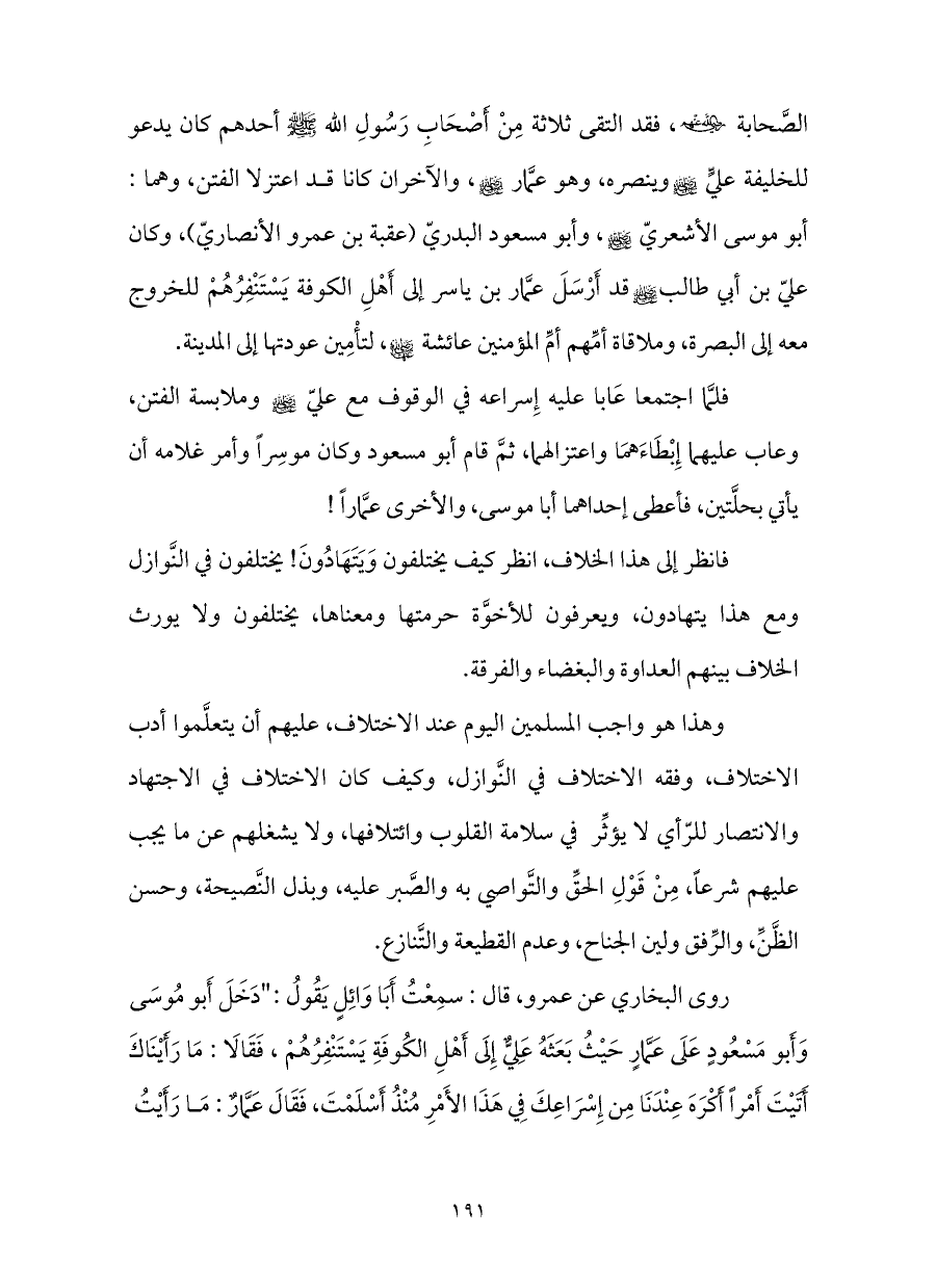 وهذا هو واجب المسلمين اليوم عند الاختلاف، عليهم أن يتعلَّموا أدب الاختلاف، وفقه الاختلاف في النَّوازل، وكيف كان الاختلاف في الاجتهاد والانتصار للرّأي لا يؤثِّر في سلامة القلوب وائتلافها، ولا يشغلهم عن ما يجب عليهم شرعاً، مِنْ قَوْلِ الحقِّ والتَّواصي به والصَّبر عليه، وبذل النَّصيحة، وحسن الظَّنِّ، والرِّفق ولين الجناح، وعدم القطيعة والتَّنازع.