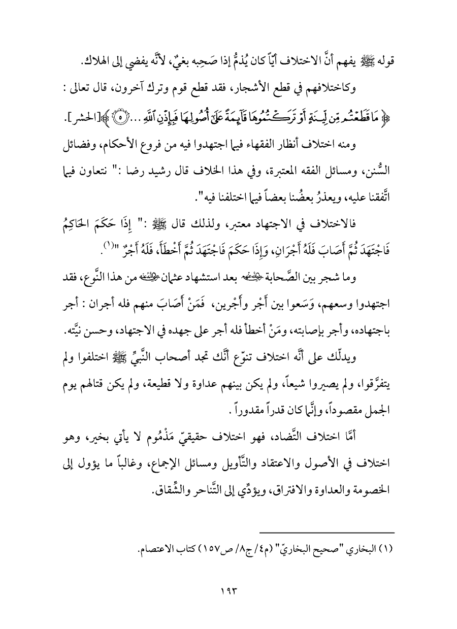 ويدلّك على أنَّه اختلاف تنوّع أنَّك تجد أصحاب النَّبيِّ - صلى الله عليه وسلم - اختلفوا ولم يتفرَّقوا، ولم يصيروا شيعاً، ولم يكن بينهم عداوة ولا قطيعة، ولم يكن قتالهم يوم الجمل مقصوداً، وإنَّما كان قدراً مقدوراً.