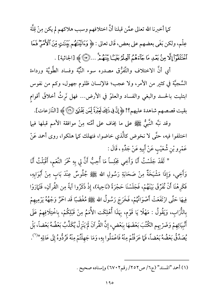 وقد نبَّه النَّبيُّ - صلى الله عليه وسلم - على ما يخاف على أمَّته مِنْ موافقة الأمم قبلها فيما اختلفوا فيه، حتَّى لا نخوض كالَّذي خاضوا، فنهلك كما هلكوا، روى أحمد عَنْ عَمْرِو بْنِ شُعَيْبٍ عَنْ أَبِيهِ عَنْ جَدِّهِ، قَالَ: