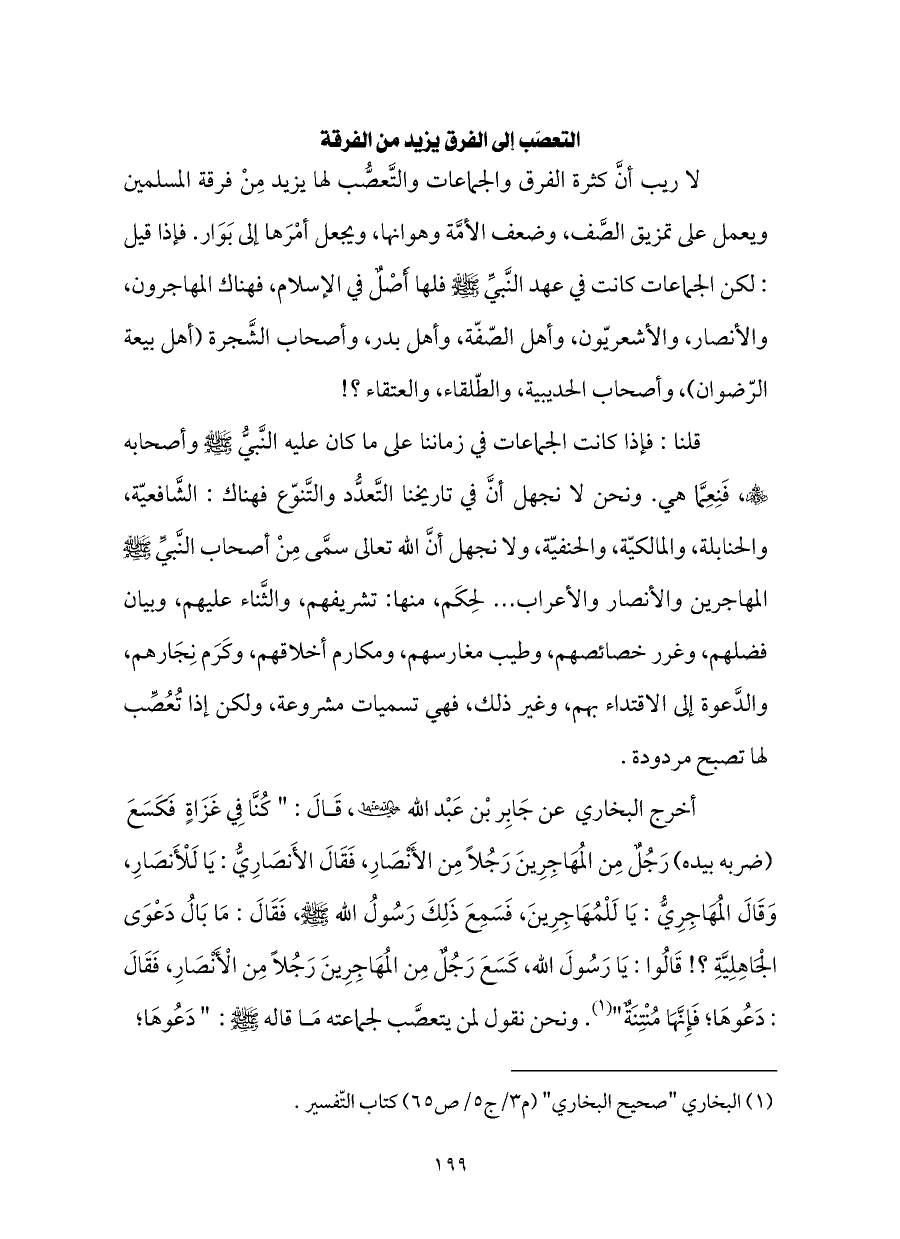 (ضربه بيده) رَجُلٌ مِنْ المُهَاجِرِينَ رَجُلاً مِنْ الأَنْصَارِ، فَقَالَ الأَنصَارِيُّ: يَا لَلْأَنصَارِ، وَقَالَ المُهَاجِرِيُّ: يَا لَلْمُهَاجِرِينَ، فَسَمِعَ ذَلِكَ رَسُولُ الله - صلى الله عليه وسلم -، فَقَالَ: مَا بَالُ دَعْوَى الْجَاهِلِيَّةِ؟! قَالُوا: يَا رَسُولَ الله، كَسَعَ رَجُلٌ مِنْ الْمُهَاجِرِينَ رَجُلاً مِنْ الْأَنْصَارِ، فَقَالَ: دَعُوهَا؛ فَإِنَّهَا مُنْتِنَةٌ" (¬١). ونحن نقول لمن يتعصَّب لجماعته مَا قاله - صلى الله عليه وسلم -: " دَعُوهَا؛