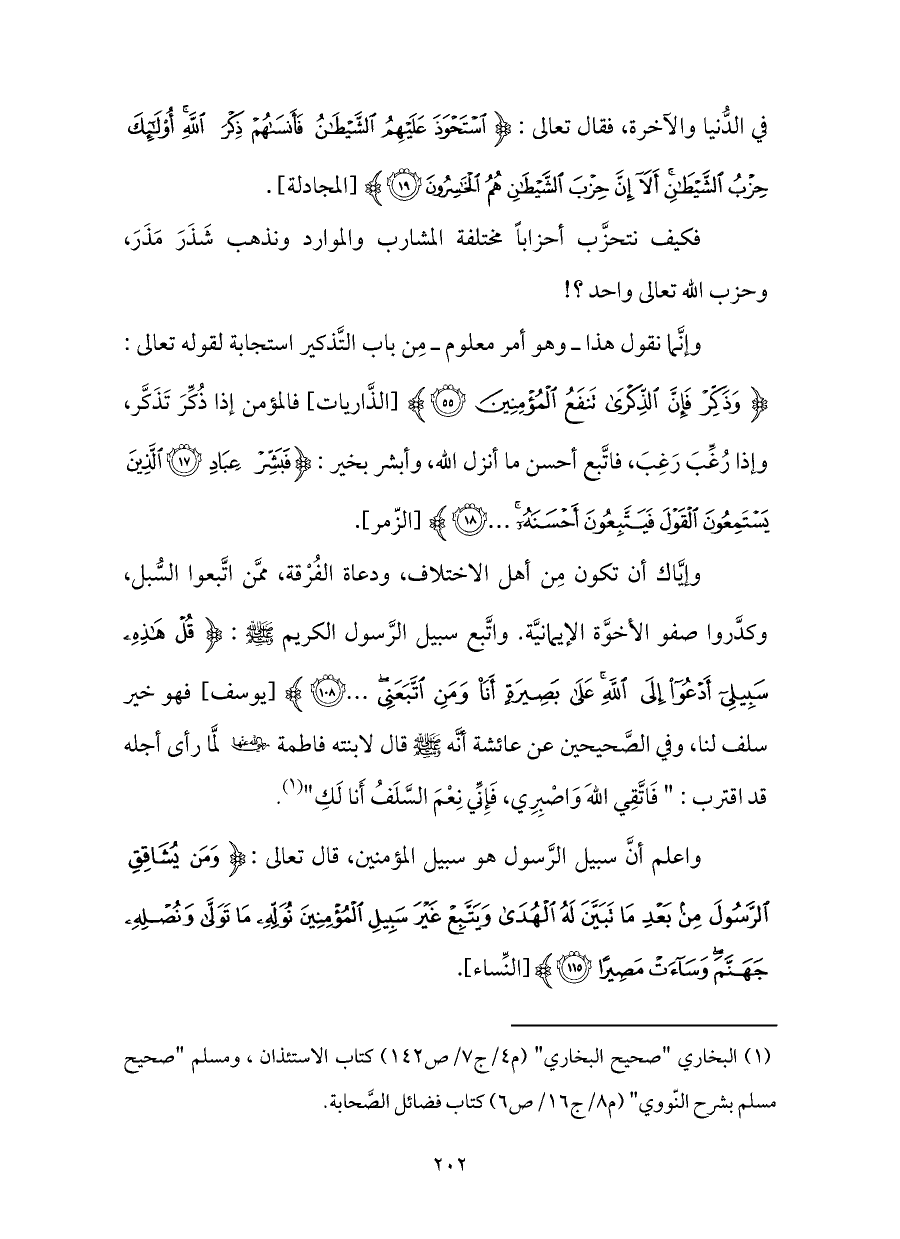 وإيَّاك أن تكون مِن أهل الاختلاف، ودعاة الفُرْقة، ممَّن اتَّبعوا السُّبل، وكدَّروا صفو الأخوَّة الإيمانيَّة. واتَّبع سبيل الرَّسول الكريم - صلى الله عليه وسلم -: {قُلْ هَذِهِ سَبِيلِي أَدْعُو إِلَى اللَّهِ عَلَى بَصِيرَةٍ أَنَا وَمَنِ اتَّبَعَنِي (١٠٨)} [يوسف] فهو خير سلف لنا، وفي الصَّحيحين عن عائشة أنَّه - صلى الله عليه وسلم - قال لابنته فاطمة - رضي الله عنها - لمَّا رأى أجله قد اقترب: " فَاتَّقِي اللهَ وَاصْبِرِي، فَإِنِّي نِعْمَ السَّلَفُ أَنا لَكِ" (¬١).