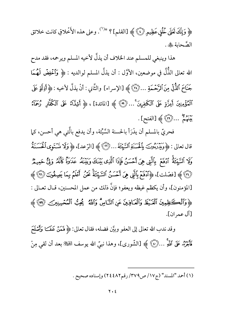 {وَإِنَّكَ لَعَلَى خُلُقٍ عَظِيمٍ (٤)} [القلم]؟ " (¬١). وعلى هذه الأَخْلاقِ كانت خلائق الصَّحابة - رضي الله عنهم -.