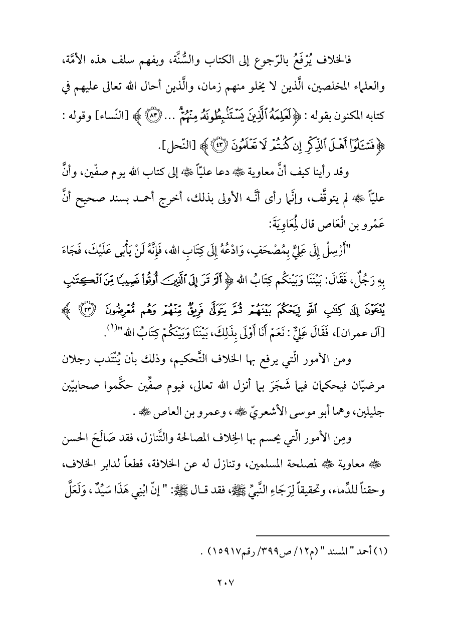وقد رأينا كيف أنَّ معاوية - رضي الله عنه - دعا عليّاً - رضي الله عنه - إلى كتاب الله يوم صفّين، وأنَّ عليّاً - رضي الله عنه - لم يتوقَّف، وإنَّما رأى أنَّه الأولى بذلك، أخرج أحمد بسند صحيح أنَّ عَمْرو بن الْعَاص قال لِمُعَاوِيَةَ: