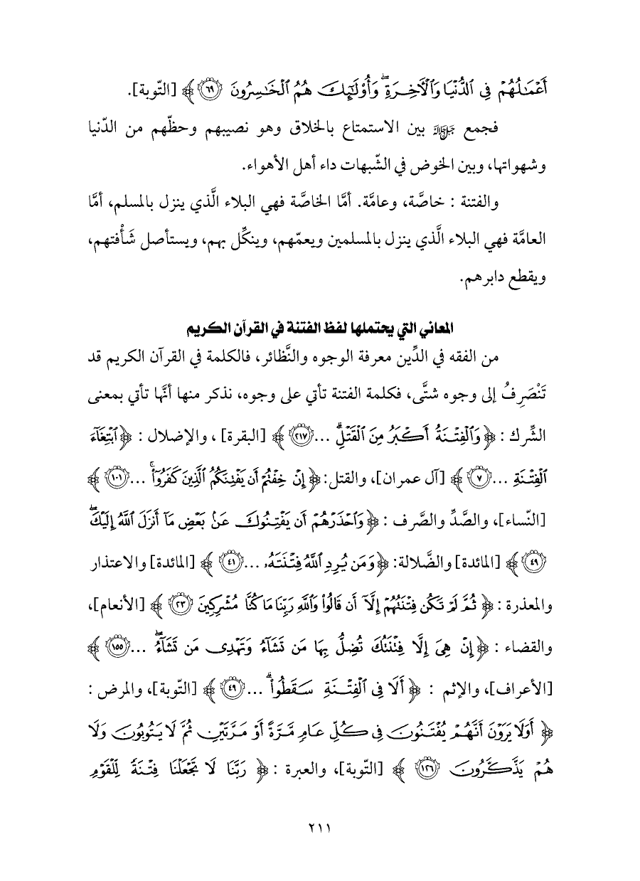 والمعذرة: {ثُمَّ لَمْ تَكُنْ فِتْنَتُهُمْ إِلَّا أَنْ قَالُوا وَاللَّهِ رَبِّنَا مَا كُنَّا مُشْرِكِينَ (٢٣)} [الأنعام]، والقضاء: {إِنْ هِيَ إِلَّا فِتْنَتُكَ تُضِلُّ بِهَا مَنْ تَشَاءُ وَتَهْدِي مَنْ تَشَاءُ (١٥٥)} [الأعراف]، والإثم: {أَلَا فِي الْفِتْنَةِ سَقَطُوا (٤٩)} [التّوبة]، والمرض: {أَوَلَا يَرَوْنَ أَنَّهُمْ يُفْتَنُونَ فِي كُلِّ عَامٍ مَرَّةً أَوْ مَرَّتَيْنِ ثُمَّ لَا يَتُوبُونَ وَلَا هُمْ يَذَّكَّرُونَ (١٢٦)} [التّوبة]، والعبرة: {رَبَّنَا لَا تَجْعَلْنَا فِتْنَةً لِلْقَوْمِ
