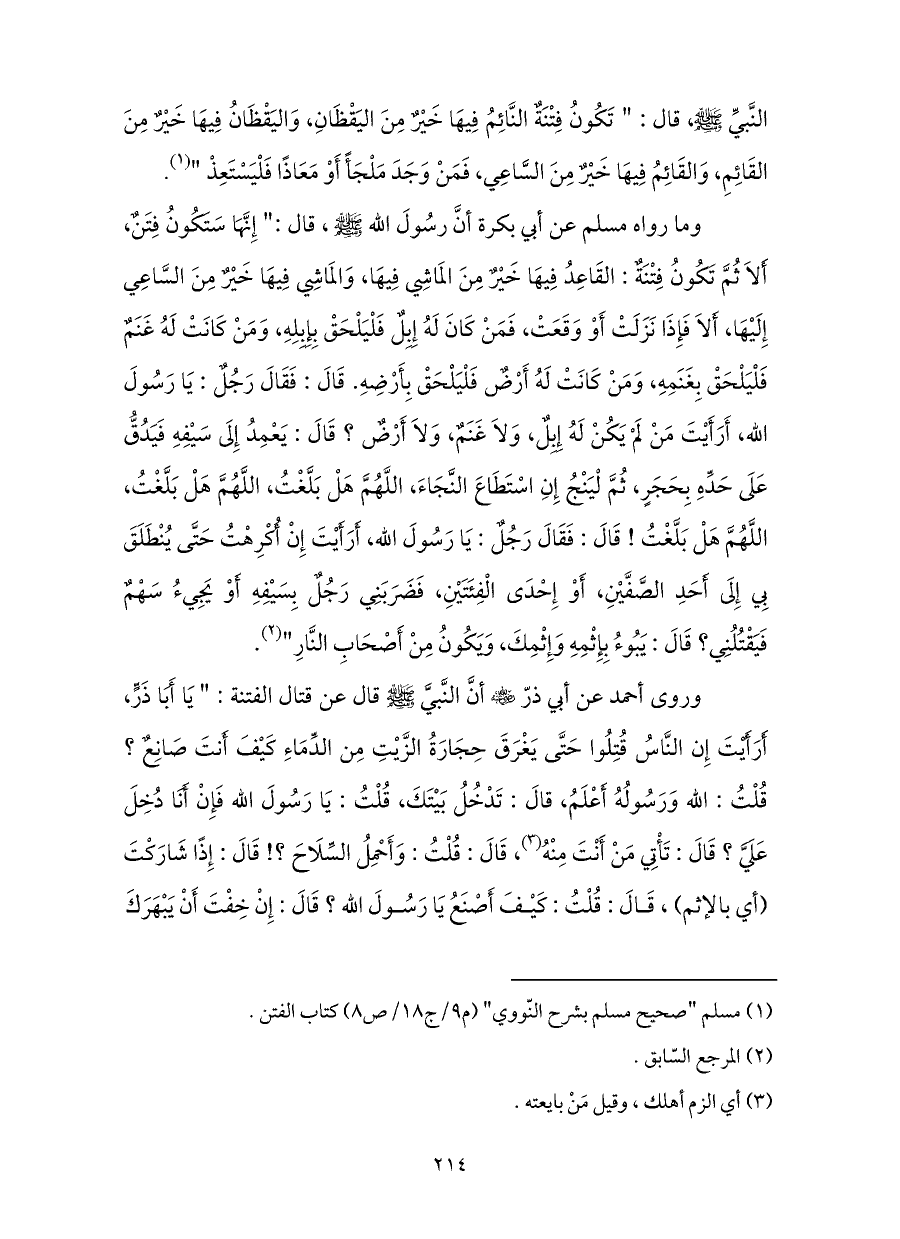 وما رواه مسلم عن أبي بكرة أنَّ رسُولَ الله - صلى الله عليه وسلم -، قال: "إِنَّهَا سَتَكُونُ فِتَنٌ، أَلَا ثُمَّ تَكُونُ فِتْنَةٌ: القَاعِدُ فِيهَا خَيْرٌ مِنَ المَاشِي فِيهَا، وَالمَاشِي فِيهَا خَيْرٌ مِنَ السَّاعِي إِلَيْهَا، أَلَا فَإِذَا نَزَلَتْ أَوْ وَقَعَتْ، فَمَنْ كَانَ لَهُ إِبِلٌ فَلْيَلْحَقْ بِإِبِلِهِ، وَمَنْ كَانَتْ لَهُ غَنَمٌ فَلْيَلْحَقْ بِغَنَمِهِ، وَمَنْ كَانَتْ لَهُ أَرْضٌ فَلْيَلْحَقْ بِأَرْضِهِ. قَالَ: فَقَالَ رَجُلٌ: يَا رَسُولَ الله، أَرَأَيْتَ مَنْ لَمْ يَكُنْ لَهُ إِبِلٌ، وَلَا غَنَمٌ، وَلَا أَرْضٌ؟ قَالَ: يَعْمِدُ إِلَى سَيْفِهِ فَيَدُقُّ عَلَى حَدِّهِ بِحَجَرٍ، ثُمَّ لْيَنْجُ إِنِ اسْتَطَاعَ النَّجَاءَ، اللَّهُمَّ هَلْ بَلَّغْتُ، اللَّهُمَّ هَلْ بَلَّغْتُ، اللَّهُمَّ هَلْ بَلَّغْتُ! قَالَ: فَقَالَ رَجُلٌ: يَا رَسُولَ الله، أَرَأَيْتَ إِنْ أُكْرِهْتُ حَتَّى يُنْطَلَقَ بِي إِلَى أَحَدِ الصَّفَّيْنِ، أَوْ إِحْدَى الْفِئَتَيْنِ، فَضَرَبَنِي رَجُلٌ بِسَيْفِهِ أَوْ يَجِيءُ سَهْمٌ فَيَقْتُلُنِي؟ قَالَ: يَبُوءُ بِإِثْمِهِ وَإِثْمِكَ، وَيَكُونُ مِنْ أَصْحَابِ النَّارِ" (¬٢).