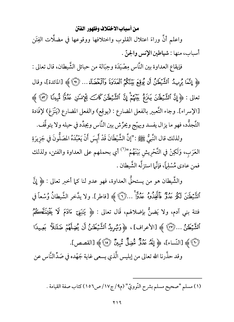 ولذلك قال النَّبيُّ - صلى الله عليه وسلم -:"إنَّ الشَّيْطَانَ قَدْ أَيِسَ أَنْ يَعْبُدَهُ المصَلُّونَ في جَزِيرَةِ العَرَبِ، وَلَكِنْ في التَّحْرِيشِ بَيْنَهُمْ" (¬١) أي بحملهم على العداوة والفتن، ولذلك فمن عادى مُسْلِماً، فإنَّما استزلَّه الشَّيطان.
