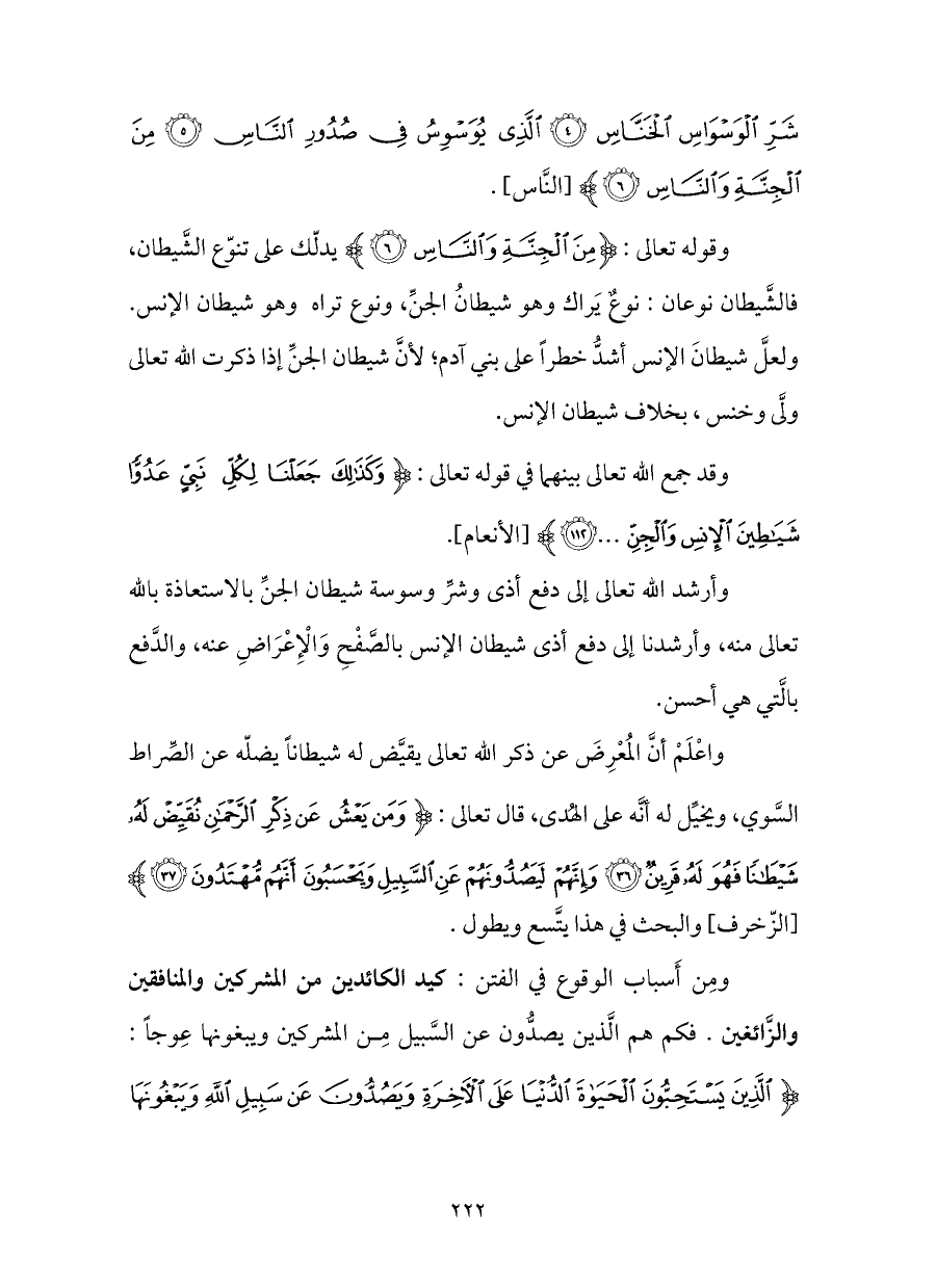 وقوله تعالى: {مِنَ الْجِنَّةِ وَالنَّاسِ (٦)} يدلّك على تنوّع الشَّيطان، فالشَّيطان نوعان: نوعٌ يَراك وهو شيطانُ الجنِّ، ونوع تراه وهو شيطان الإنس. ولعلَّ شيطانَ الإنس أشدُّ خطراً على بني آدم؛ لأنَّ شيطان الجنِّ إذا ذكرت الله تعالى ولَّى وخنس، بخلاف شيطان الإنس.